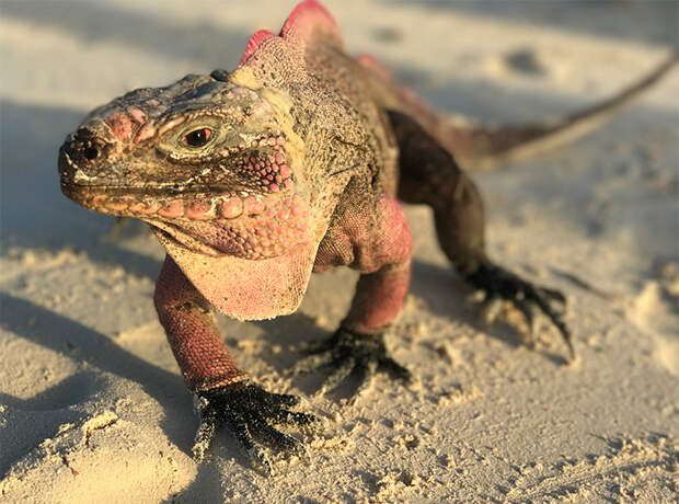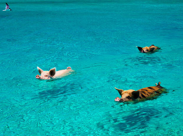 Если вы приехали на Багамы не только ради моря, солнца и рома, то вам придется привыкнуть вставать затемно – что, учитывая семичасовую разницу с Москвой, не так уж и сложно. А делать это вы будете для того, чтобы успеть на ранние утренние рейсы, курсирующие между тридцатью обитаемыми островами архипелага. Самолетики тут крошечные, с двумя винтами и свободной рассадкой. Этим обстоятельством стоит воспользоваться, чтобы устроиться прямо за спиной у пилота, – панорама откроется такая, что ваш инстаграм взорвется от лайков. Аэропорты на островах тоже забавные: все без исключения международные, с таможней, но при этом на Большой Эксуме, например, зоной прилета и залом ожидания одновременно служит бар с танцевальной стойкой. Но задерживаться там не стоит, лучше пересесть на прогулочный катер и поплыть вокруг острова под бодрый R’n’B. Классических точек для остановки три. В первой можно с деревянного помоста покормить морских черепах. Они очень аккуратно берут обрезки конча (моллюск, который составляет основу традиционной багамской кухни) и качают крупными головами. Во второй вас ждет главный аттракцион – плавающие свиньи. Признаюсь, мы рассчитывали увидеть резвящихся в воде мини-пигов, но оказалось, что плавать нам предлагают с настоящими боровами – огромными и любвеобильными. Впрочем, не проникнуться их обаянием все равно невозможно. Последний заход – это пляж с игуанами, тоже абсолютно ручными и теплыми от солнца. Запасайтесь салатом в пакетиках: потомки драконов его обожают.