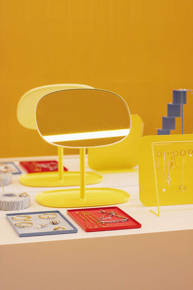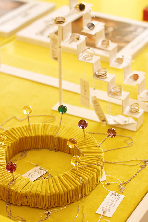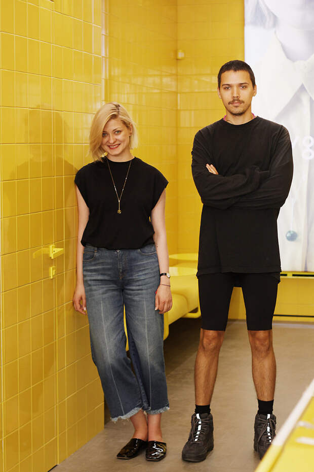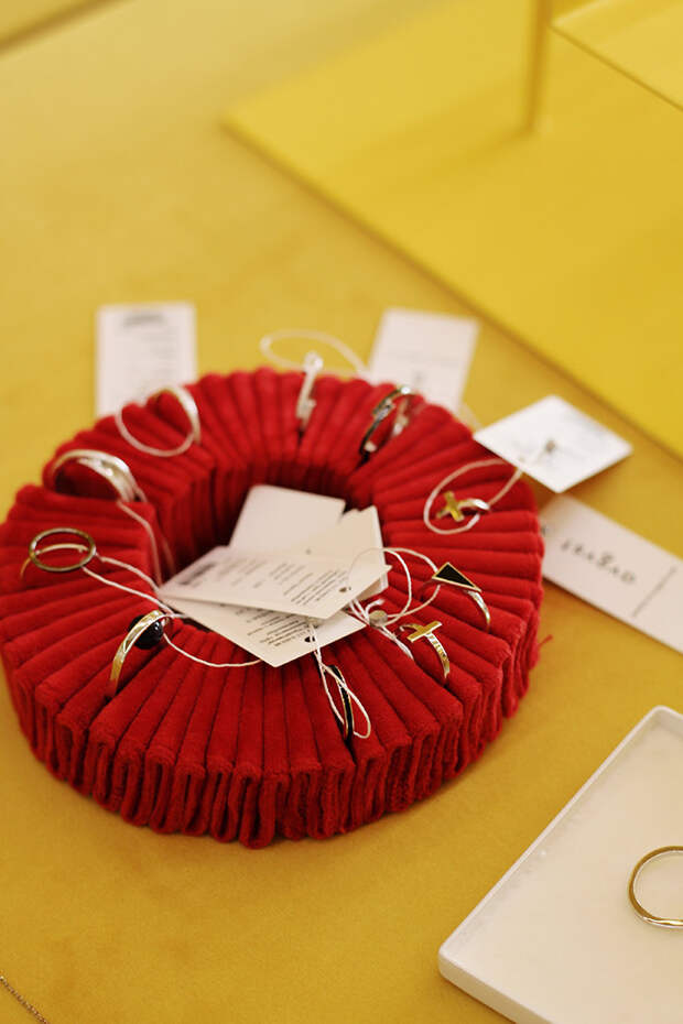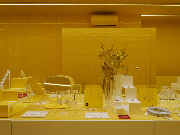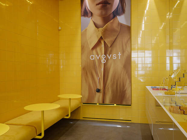 В магазине желтое все: от плиточных стен до бархатных прилавков. Это очень августовский цвет. Такое энергичное колористическое решение – заслуга архитектора и художника Гарри Нуриева, который работал над интерьером совместно с Crosby Studios. С ребятами мы познакомились благодаря Дине Сагидуллиной, дизайнеру ювелирной марки Himère. Ее украшения можно будет найти в нашем магазине.