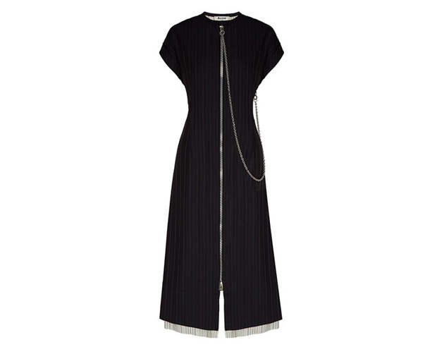 Уже не первый сезон цепи занимают лидирующие позиции в списке главных трендов. И если раньше наши эксперименты заканчивались на сумках, сегодня цепи везде. Например, на платьях – как у Acne Studios. Такие модели лучше всего балансировать чем-то простым – скажем, базовыми кедами или привычными жокейскими сапогами. Особое внимание этом году стоит обратить на обувь с цепями. Акцентные мюли от JW Anderson или нарядные туфли от Jil Sander повысят градус стиля в любом образе.