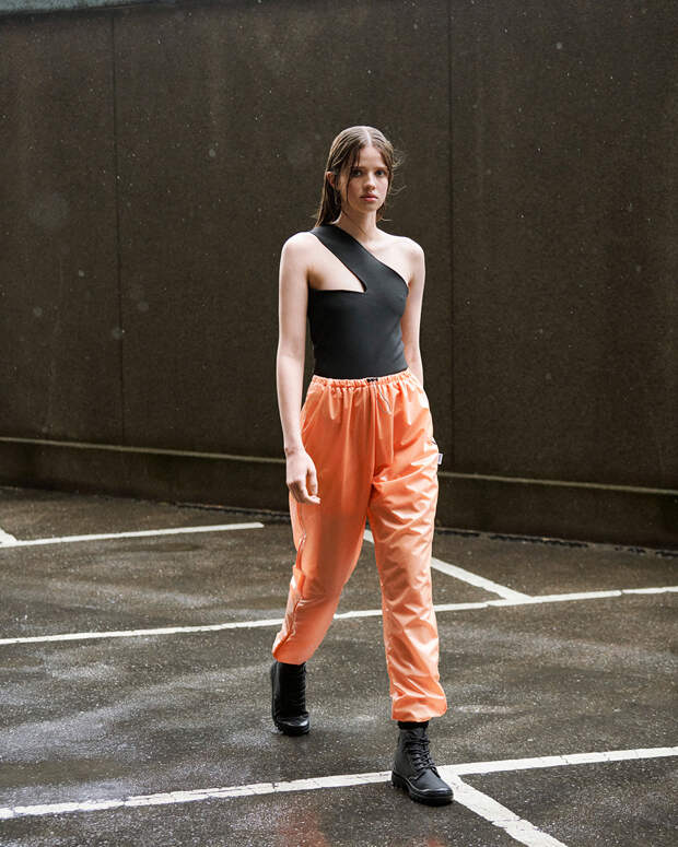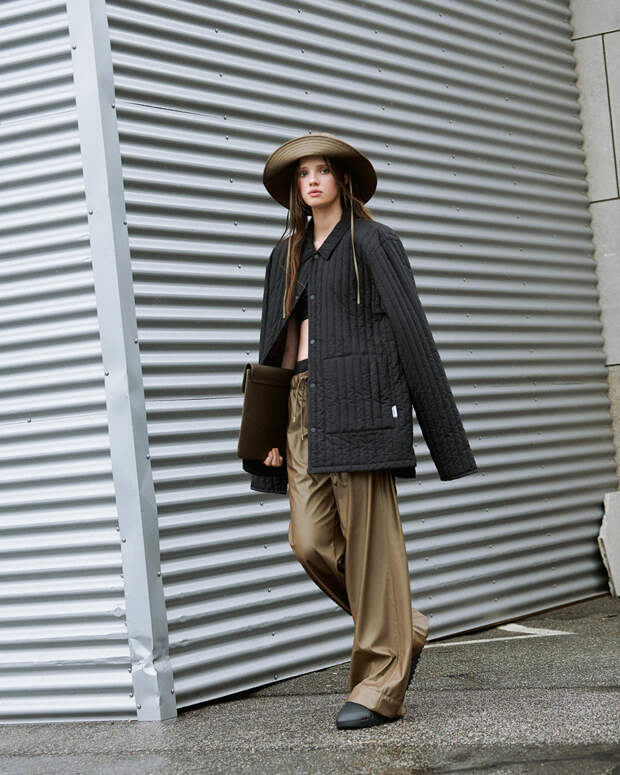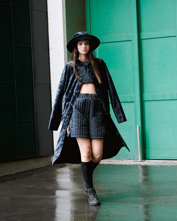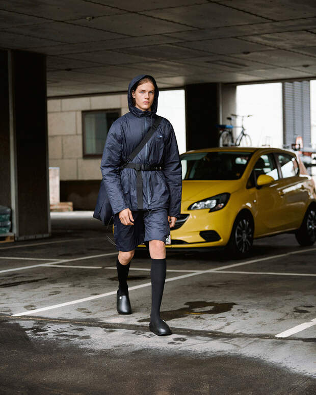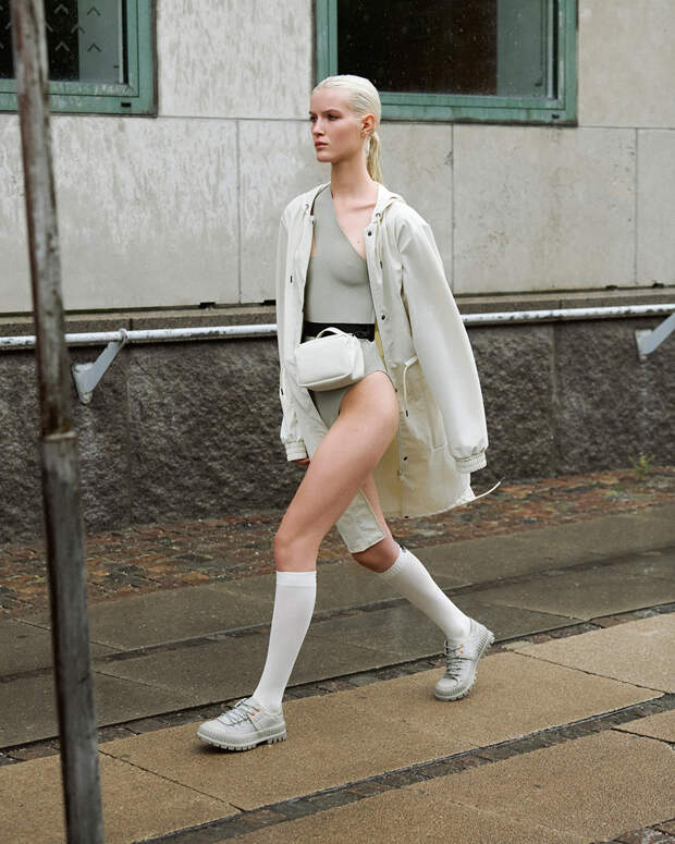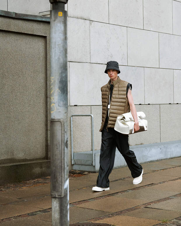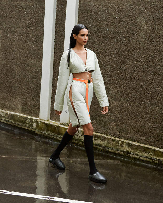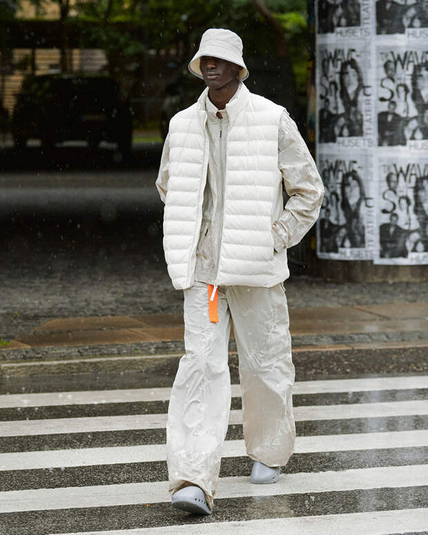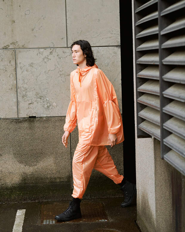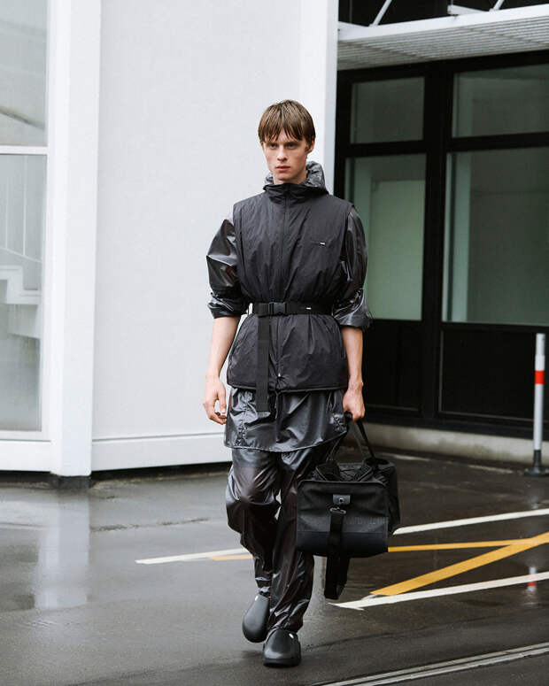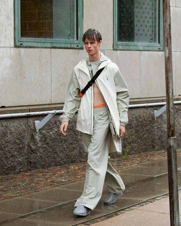 Атмосфера фэшн-фильма Rains, который в этот раз заменил показ, оказалась удивительно похожа на московское лето в этом году. В ролике идет проливной дождь, а все прохожие одеты в легкие дождевики, нейлоновые панамы, дутые жилеты и резиновые клоги. Наш личный фаворит в этой коллекции — костюмы-дождевики, состоящие из ярко-оранжевых брюк и анораков. Если дополнить их резиновой косынкой с логотипом марки, то промокнуть вам точно не грозит — даже если на улице льет, как из ведра.