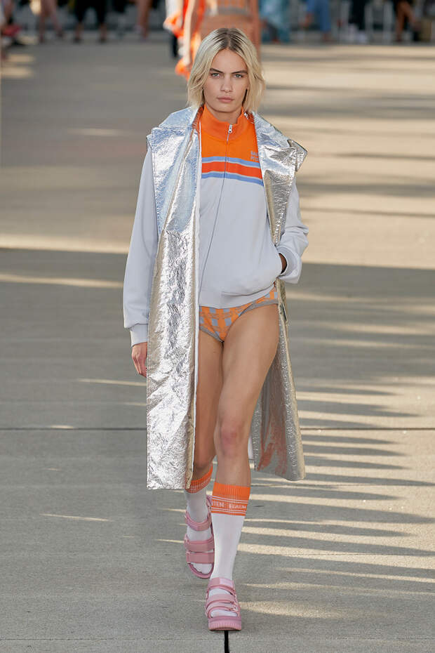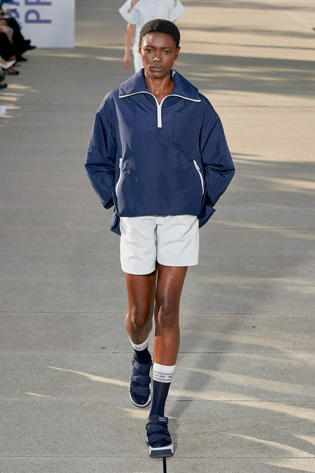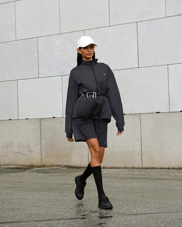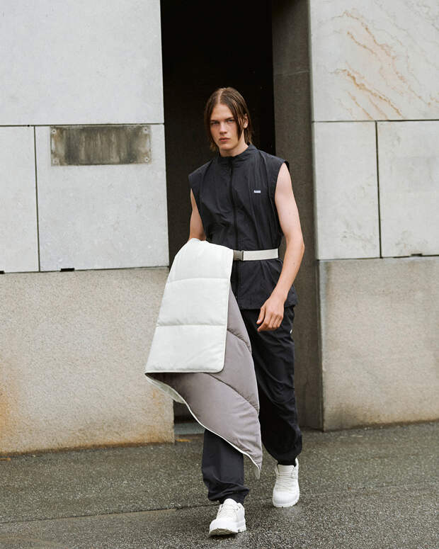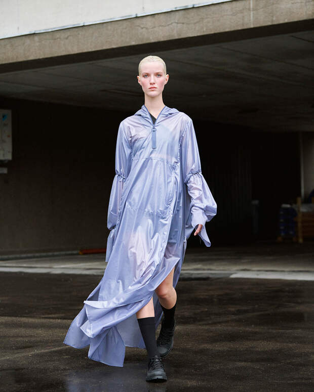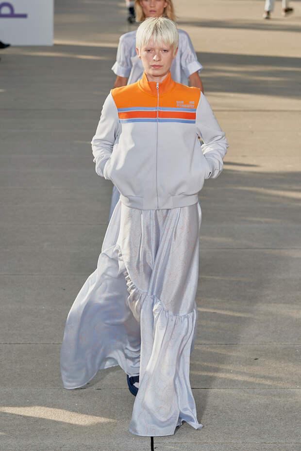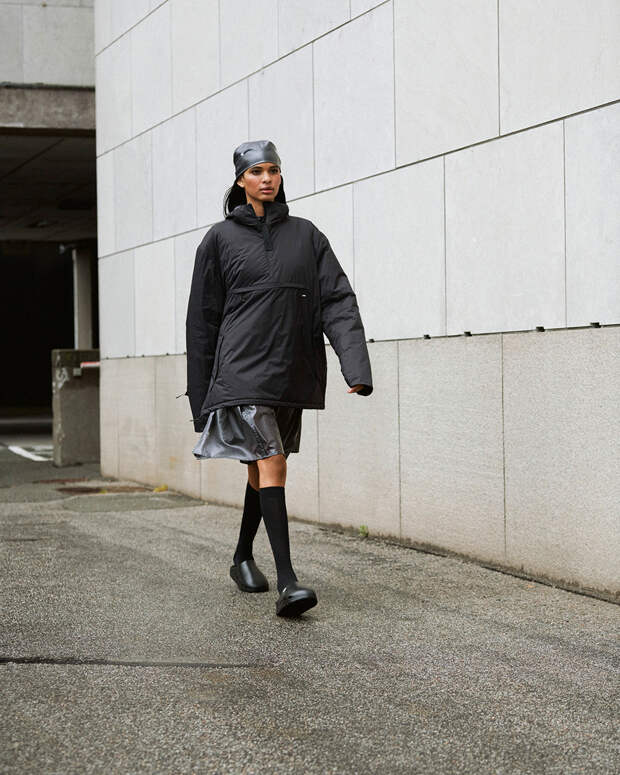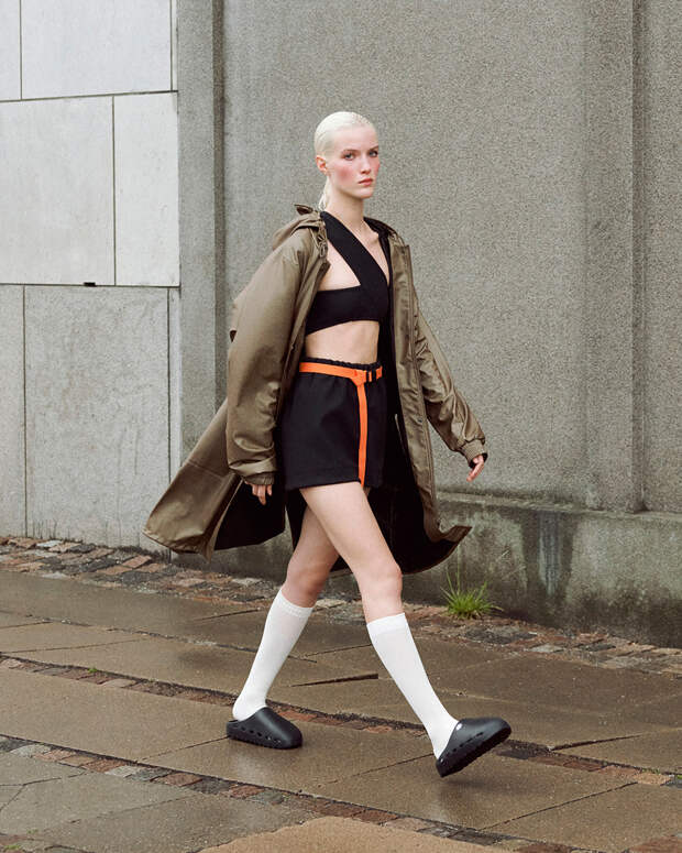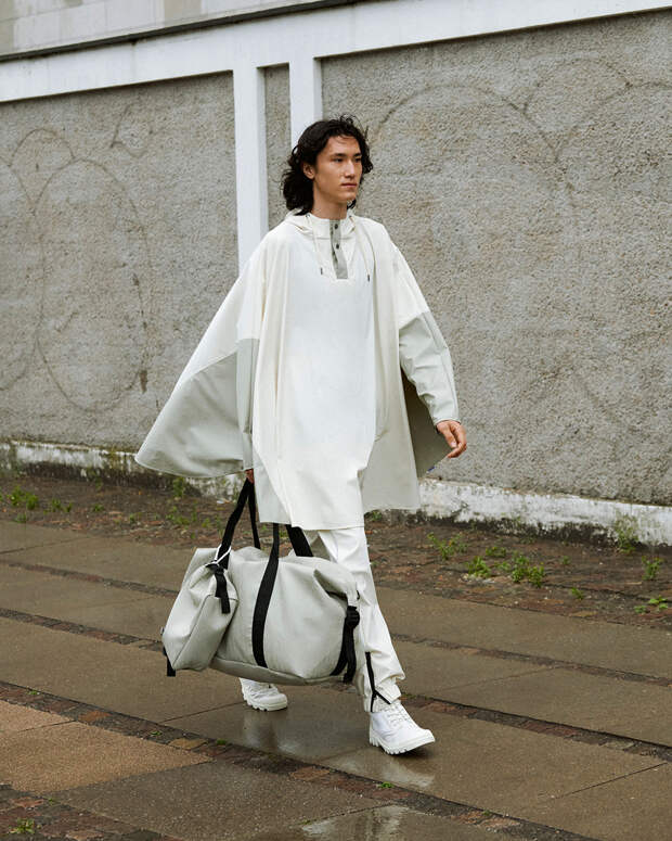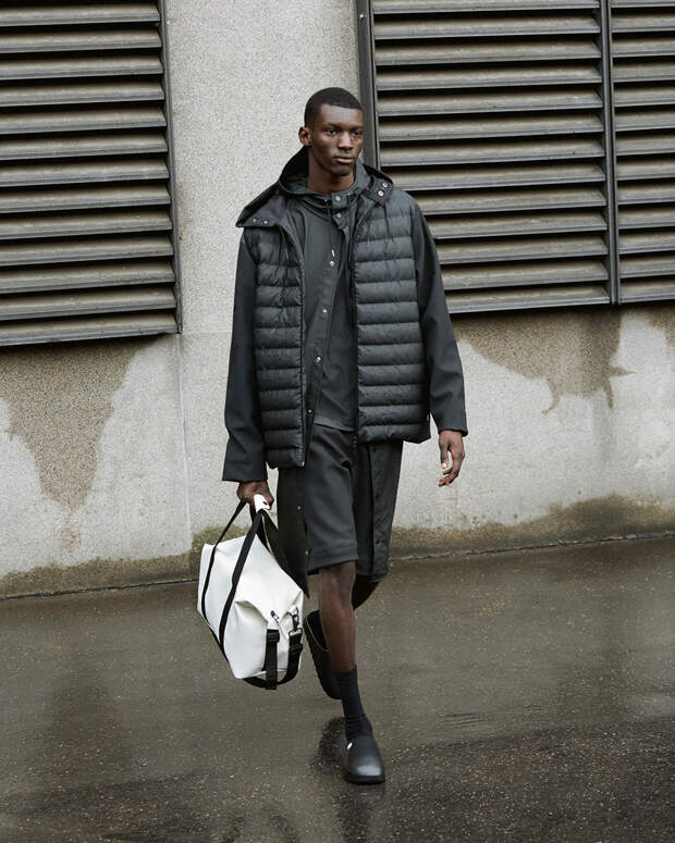 Атмосфера фэшн-фильма Rains, который в этот раз заменил показ, оказалась удивительно похожа на московское лето в этом году. В ролике идет проливной дождь, а все прохожие одеты в легкие дождевики, нейлоновые панамы, дутые жилеты и резиновые клоги. Наш личный фаворит в этой коллекции — костюмы-дождевики, состоящие из ярко-оранжевых брюк и анораков. Если дополнить их резиновой косынкой с логотипом марки, то промокнуть вам точно не грозит — даже если на улице льет, как из ведра.