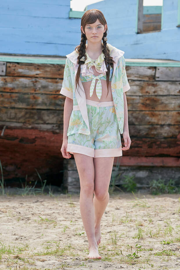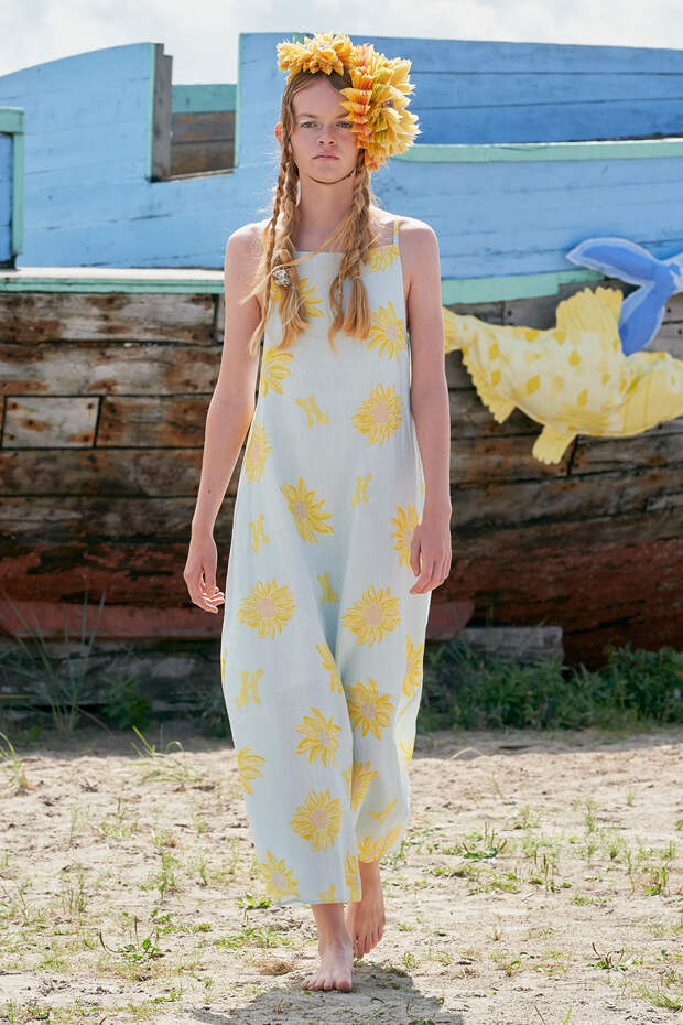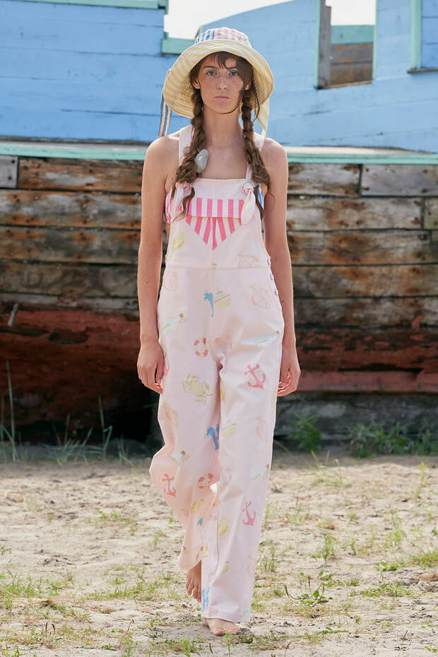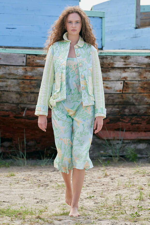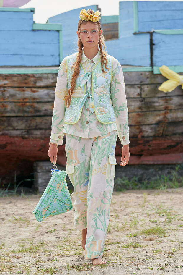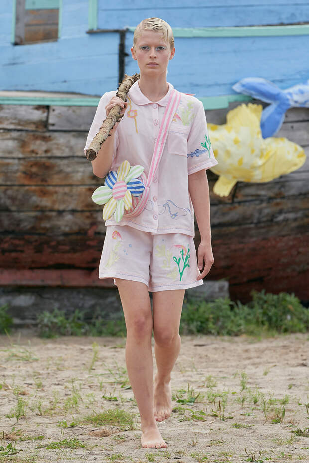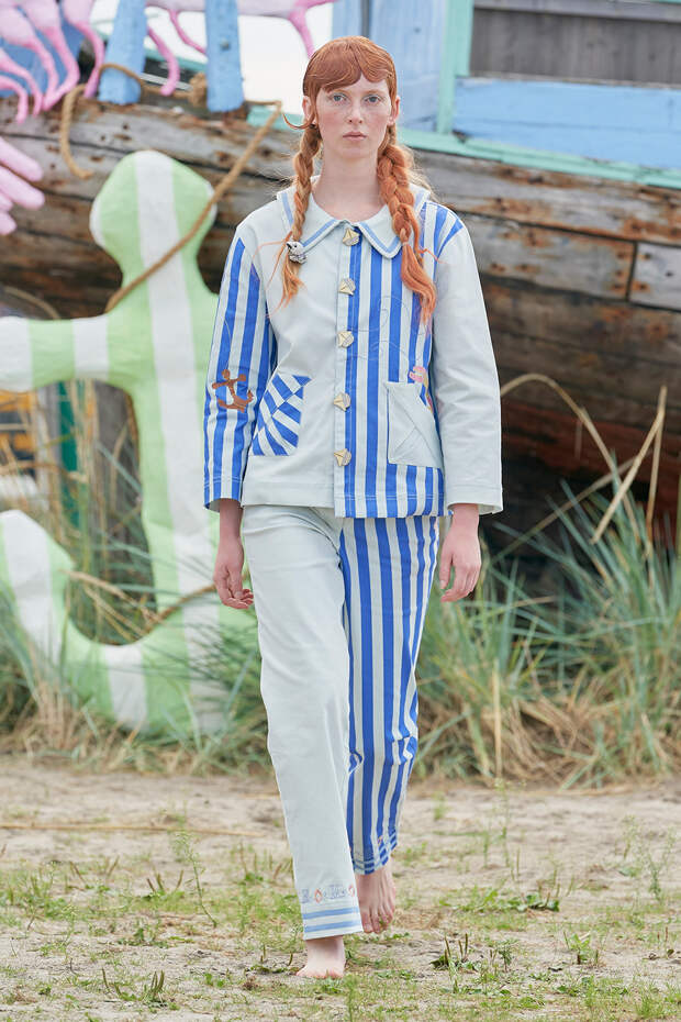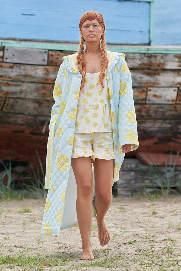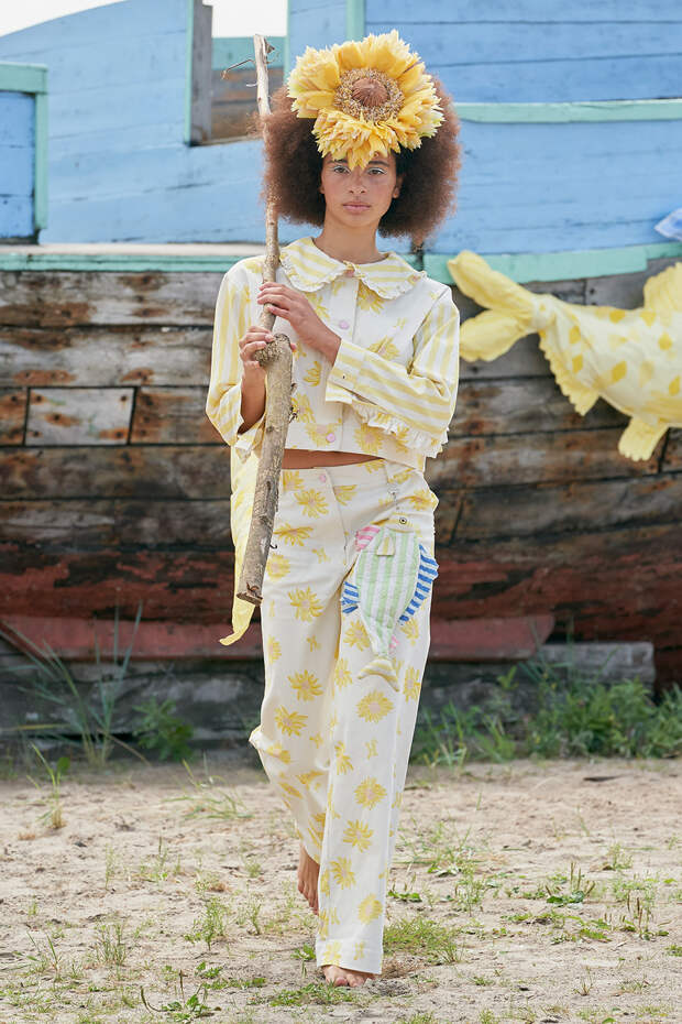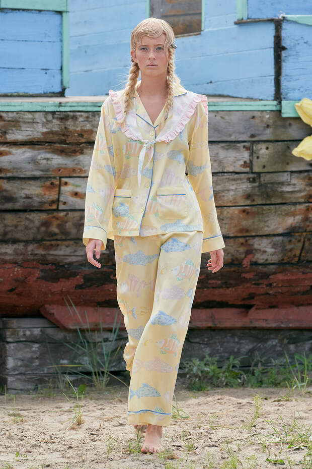 Полуфиналистка LVMH Prize 2020 Эмили Хельмштедт решила поддержать тренд на инфантильные, почти детские по духу вещи: для своей новой коллекции она создала жакеты и стеганые пальто с трогательными отложными воротничками, пижамные костюмы и купальники с наивными принтами с изображениями рыбок и брюки, усыпанные ярко-желтыми подсолнухами. Хотите ненадолго сбежать от тягот взрослой жизни и почувствовать себя Пеппи Длинныйчулок? Эти вещи — то, что нужно.