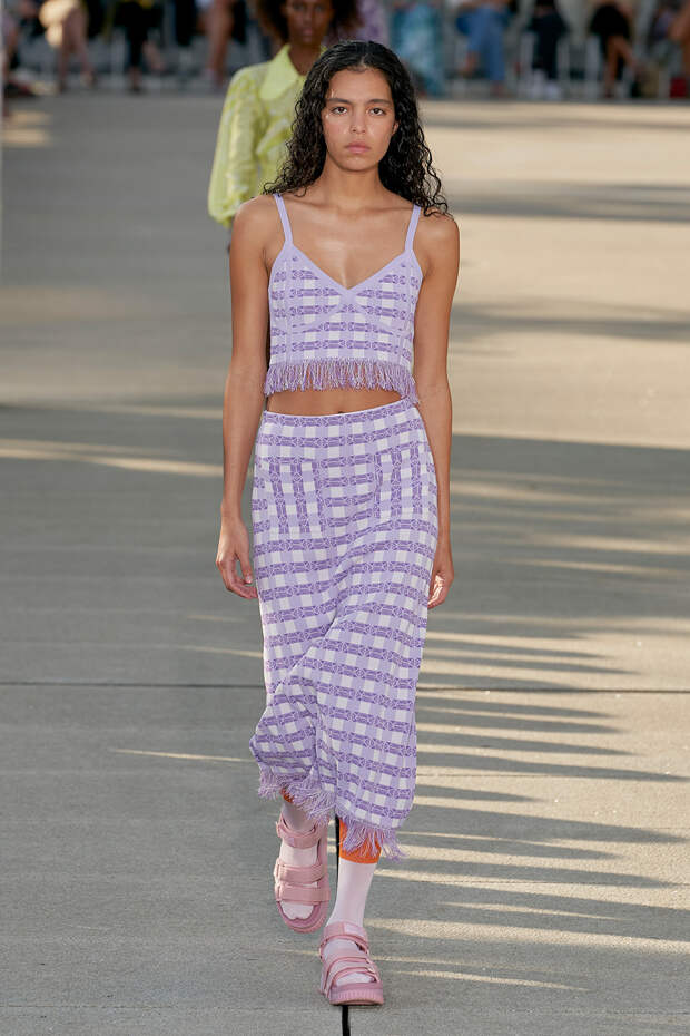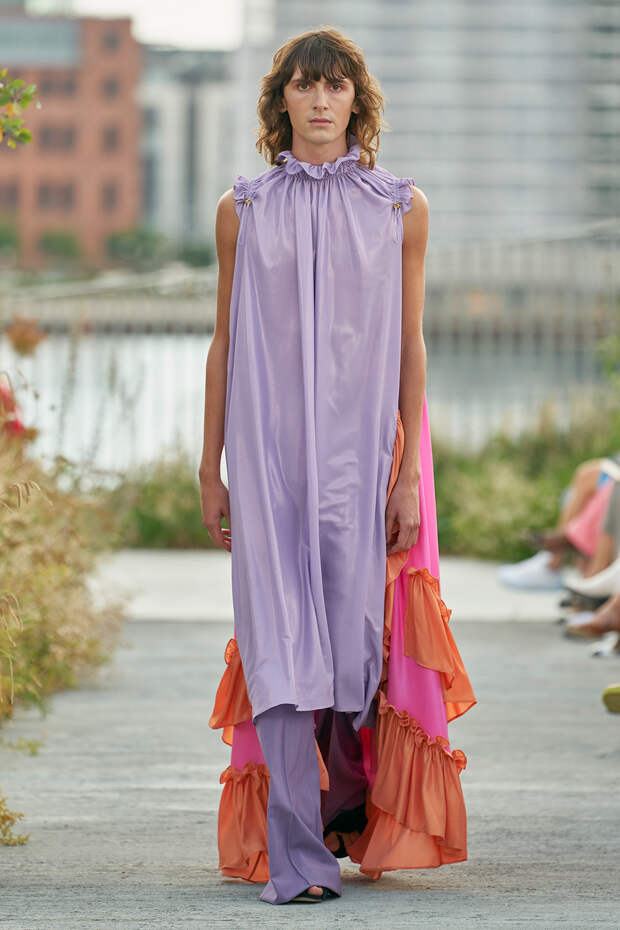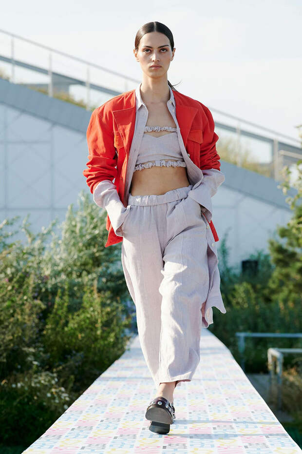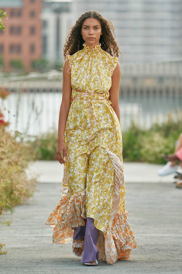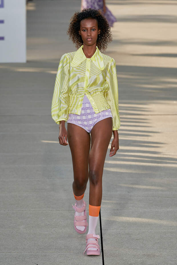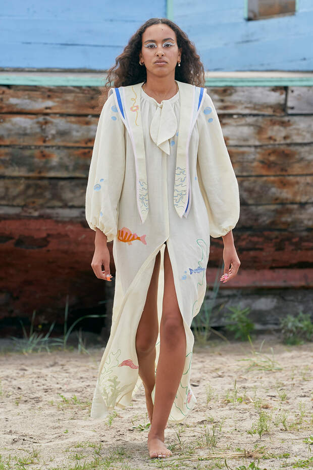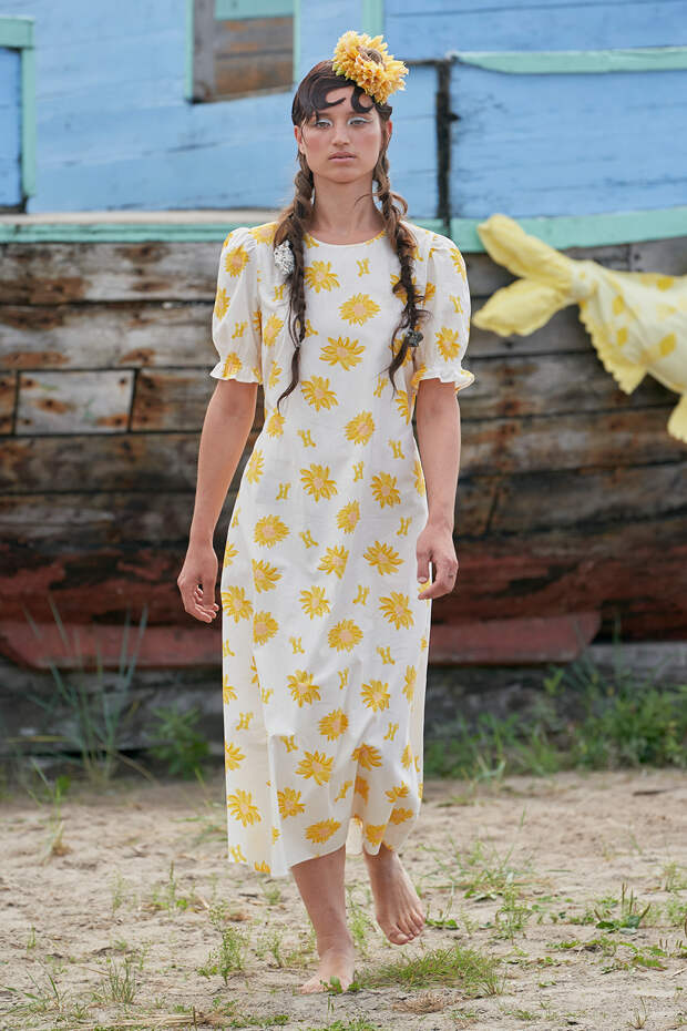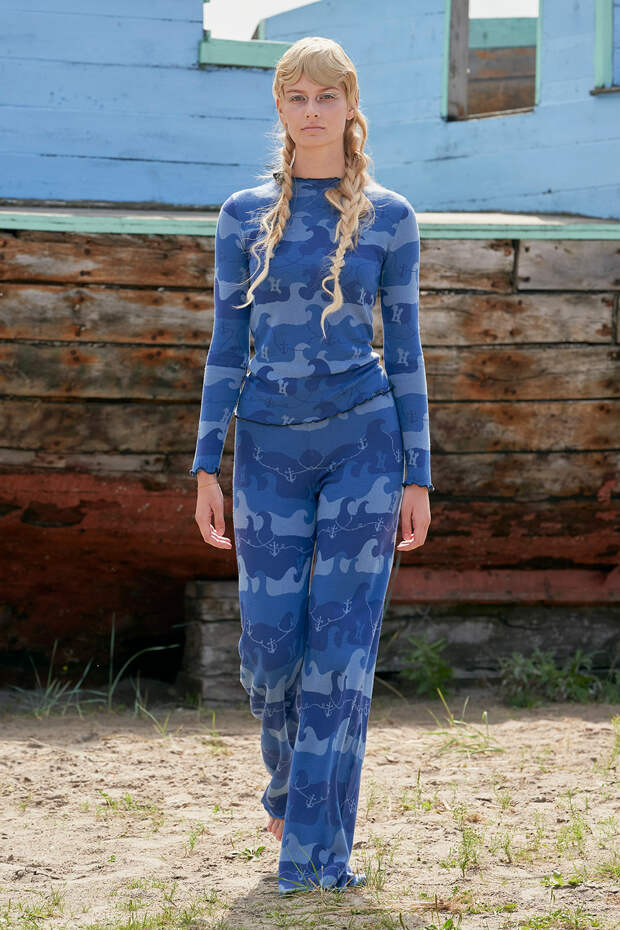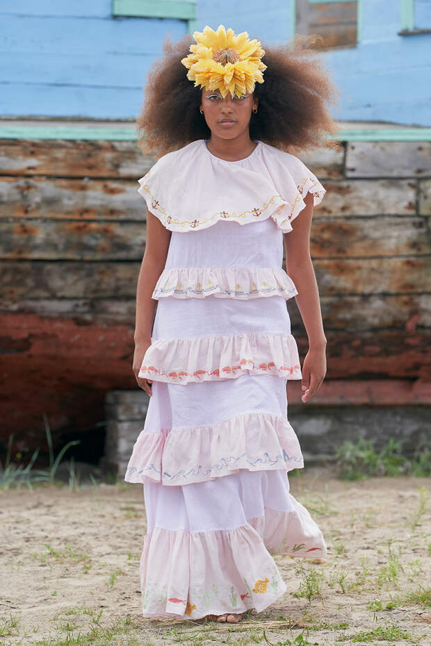 Полуфиналистка LVMH Prize 2020 Эмили Хельмштедт решила поддержать тренд на инфантильные, почти детские по духу вещи: для своей новой коллекции она создала жакеты и стеганые пальто с трогательными отложными воротничками, пижамные костюмы и купальники с наивными принтами с изображениями рыбок и брюки, усыпанные ярко-желтыми подсолнухами. Хотите ненадолго сбежать от тягот взрослой жизни и почувствовать себя Пеппи Длинныйчулок? Эти вещи — то, что нужно.
