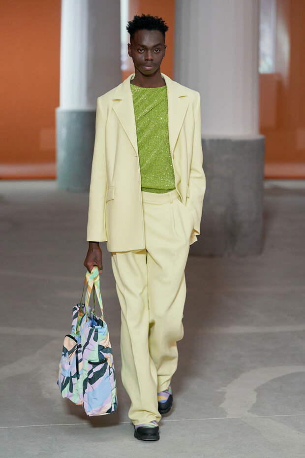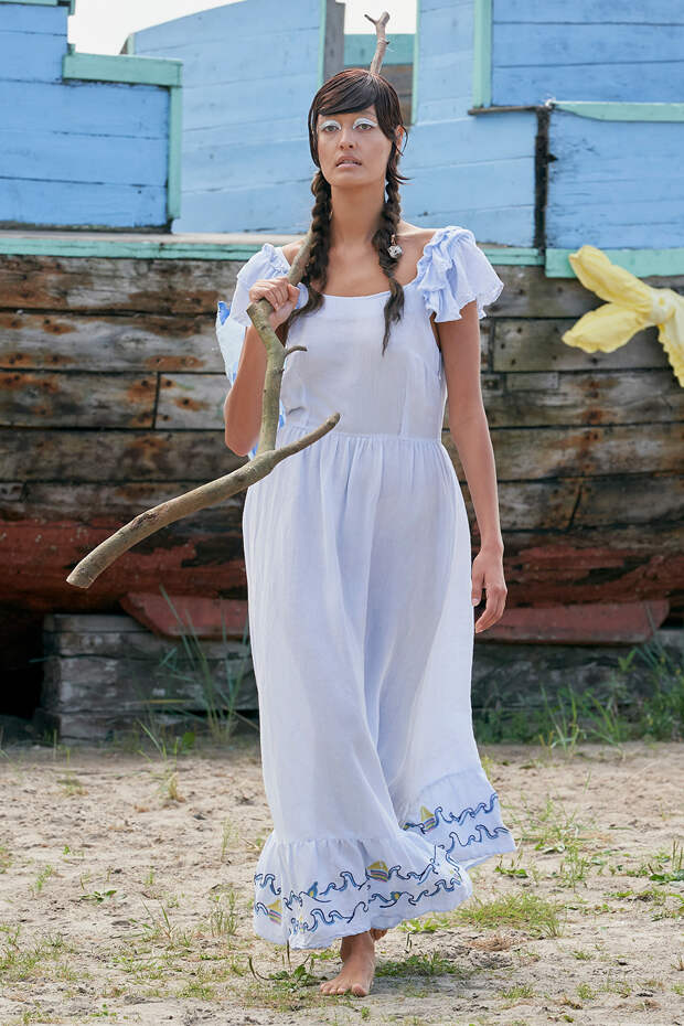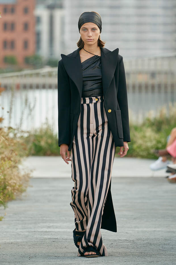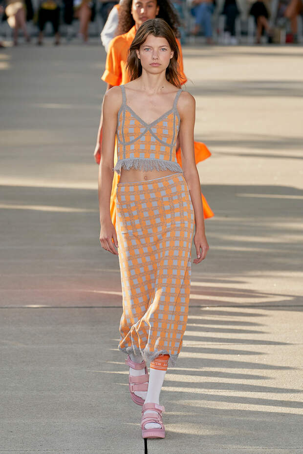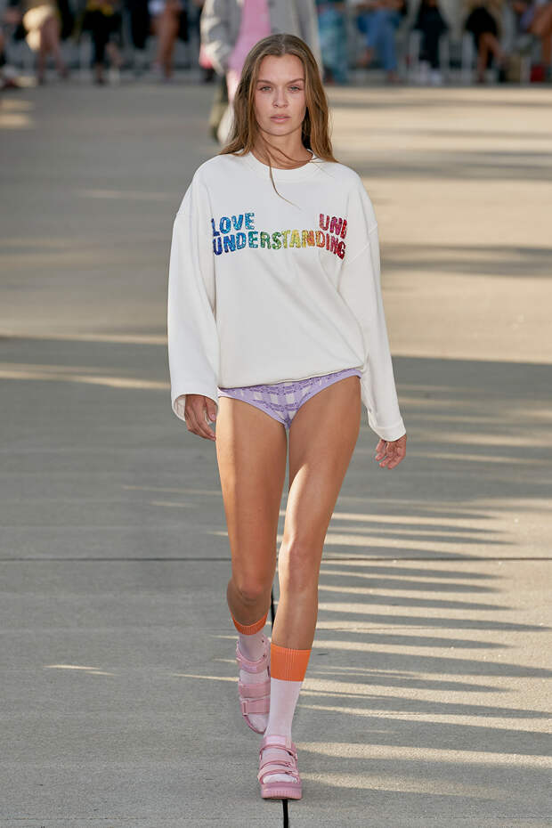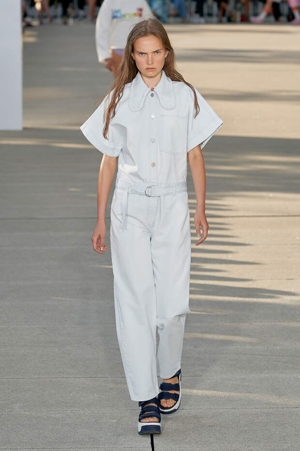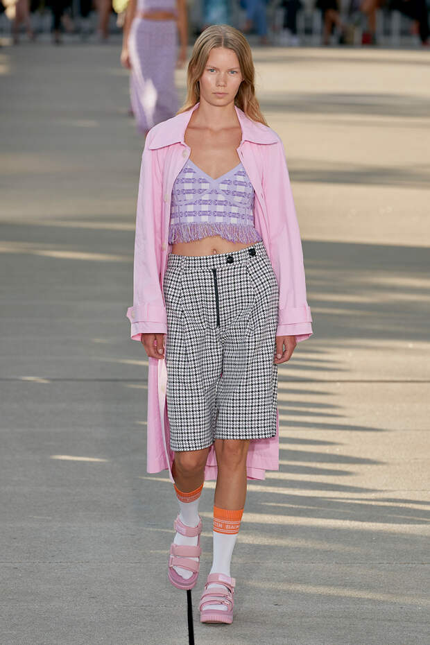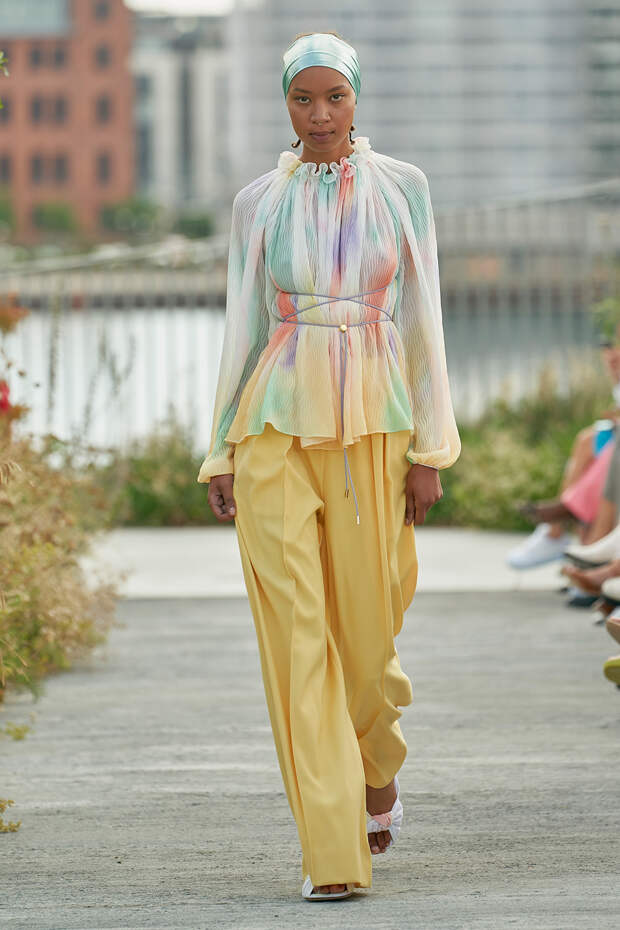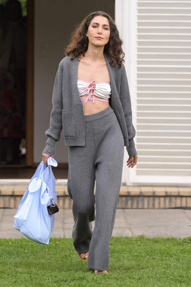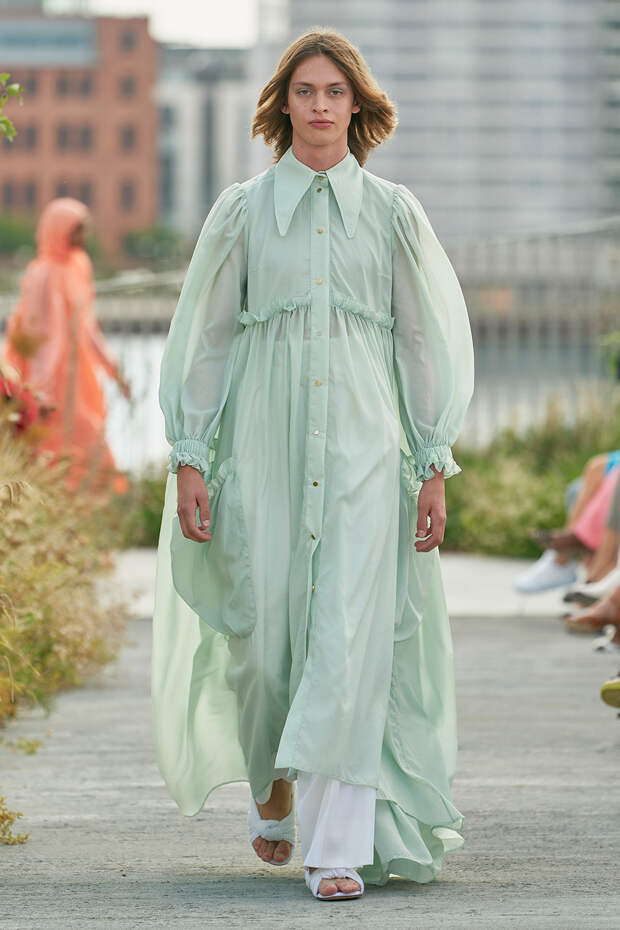 Полуфиналистка LVMH Prize 2020 Эмили Хельмштедт решила поддержать тренд на инфантильные, почти детские по духу вещи: для своей новой коллекции она создала жакеты и стеганые пальто с трогательными отложными воротничками, пижамные костюмы и купальники с наивными принтами с изображениями рыбок и брюки, усыпанные ярко-желтыми подсолнухами. Хотите ненадолго сбежать от тягот взрослой жизни и почувствовать себя Пеппи Длинныйчулок? Эти вещи — то, что нужно.