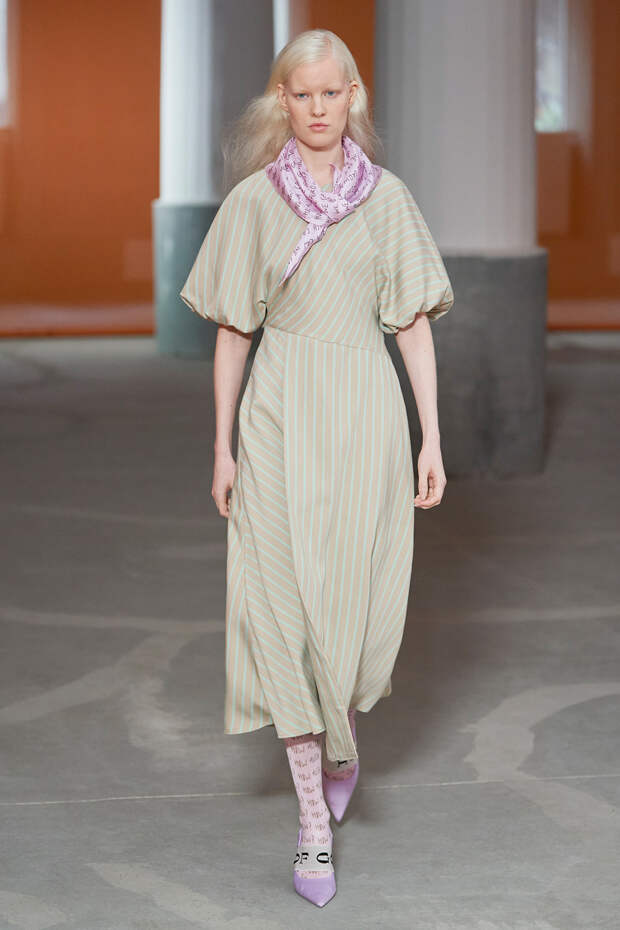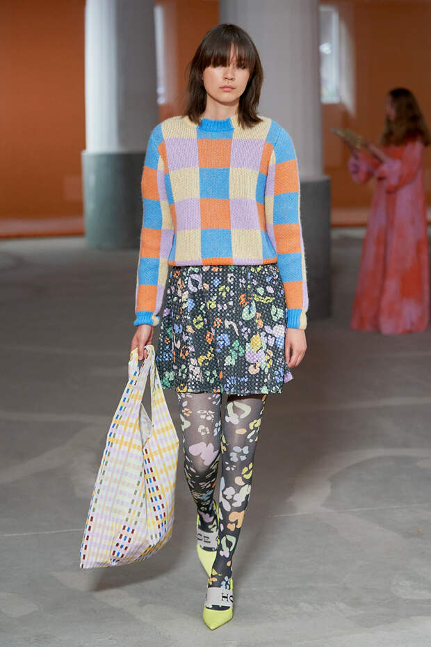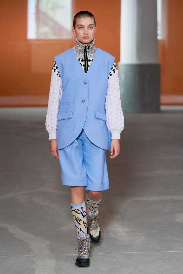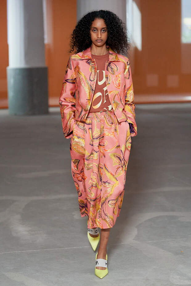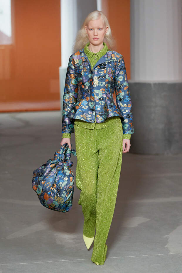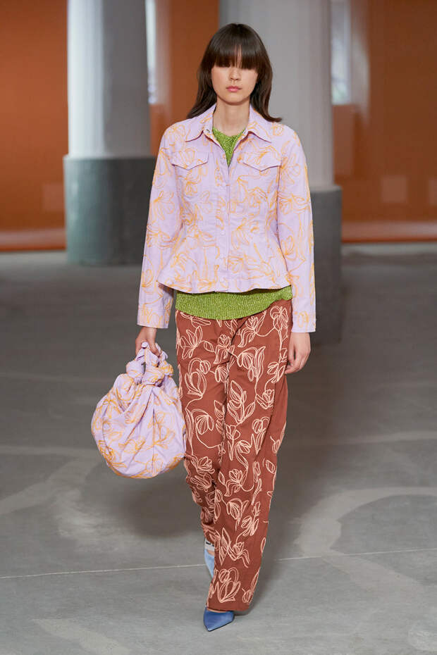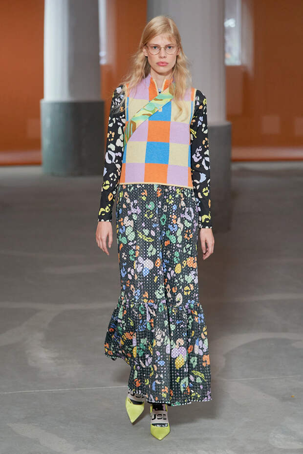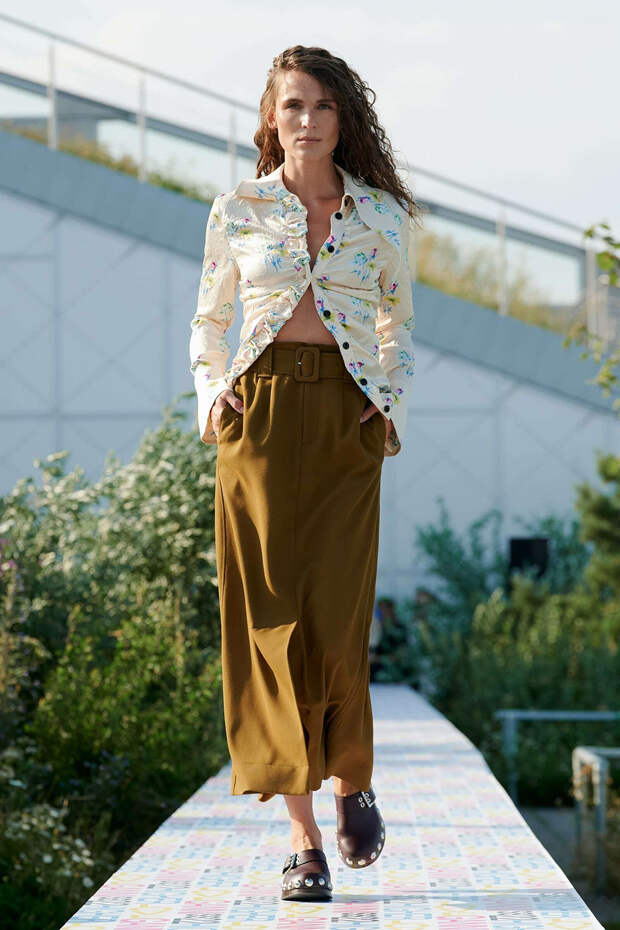 Ganni уже с трудом можно назвать локальным брендом: на его счету два успешных сотрудничества с Levi's, работа с лучшими мультибрендами по всему миру и суперзвезды вроде Рианны и Бейонсе в рядах верных поклонниц. И, конечно, очень узнаваемый почерк: их блузки и платья с отложными воротничками трудно с чем-то спутать. При этом в новой коллекции нет ни этих самых воротничков, ни другого важного кода марки — леопардового принта. По словам креативного директора Дитте Реффстру, она вдохновилась тем, как ее клиентки развлекались неожиданными сочетаниями вещей, скучая во время локдауна. Поэтому в коллекции появились яркие «треники» с подвернутыми манжетами, коктейльные платья, надетые поверх рубашек (и с «мужским» жакетом сверху!) и, конечно, главная постпандемийная обувь, которую теперь носят со всем и под все: клоги.