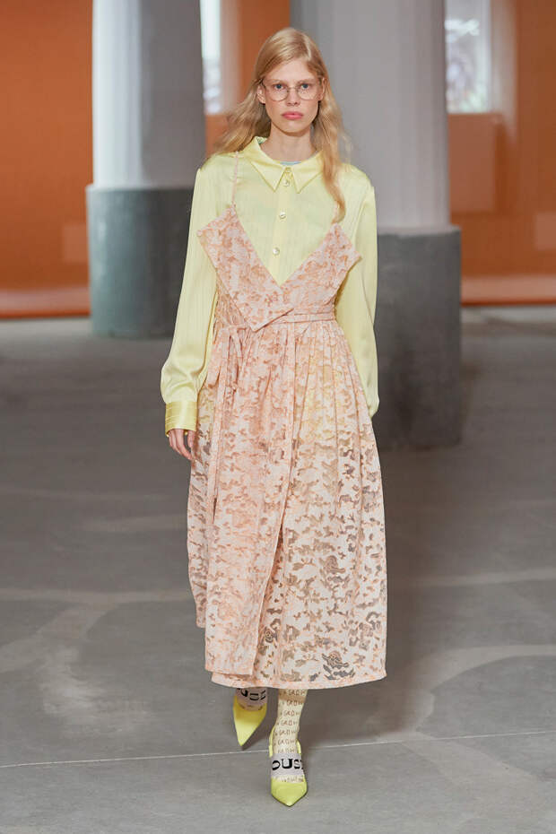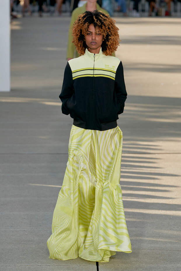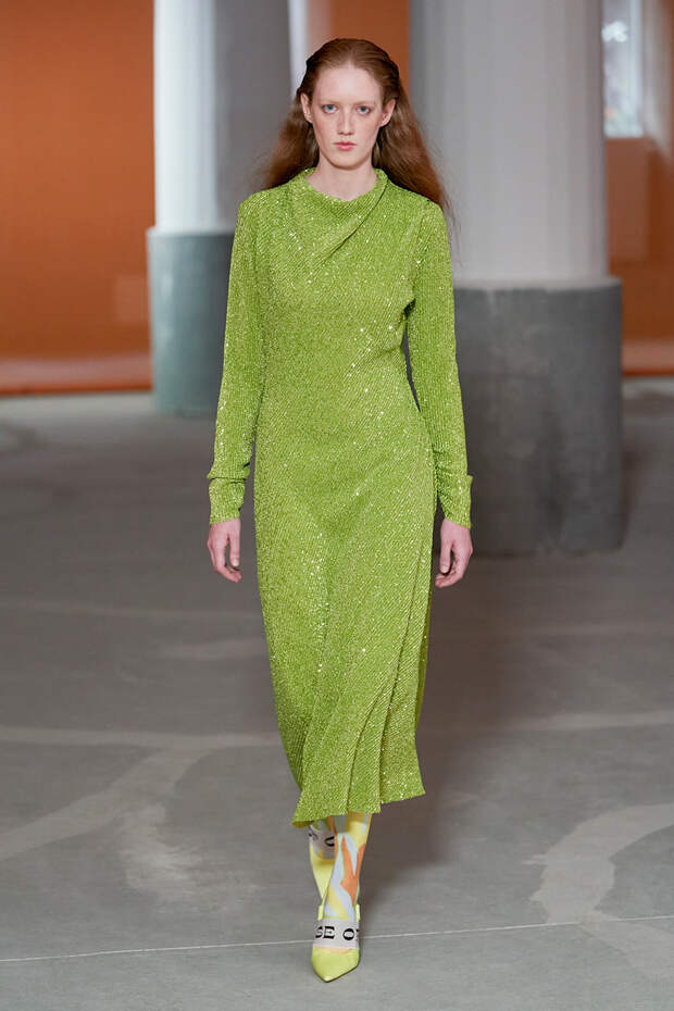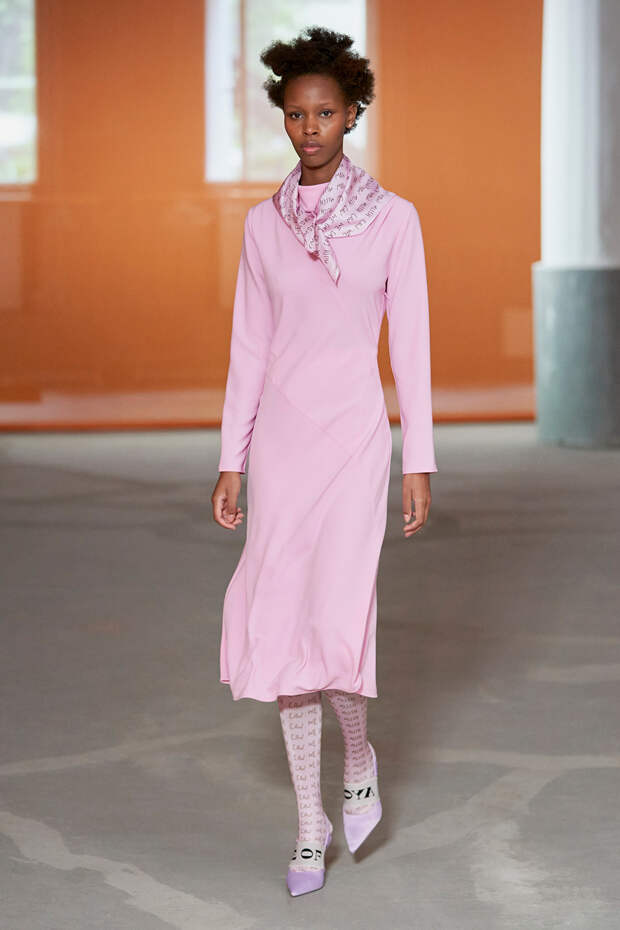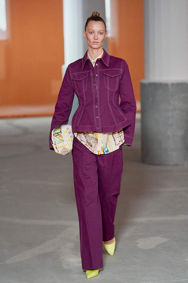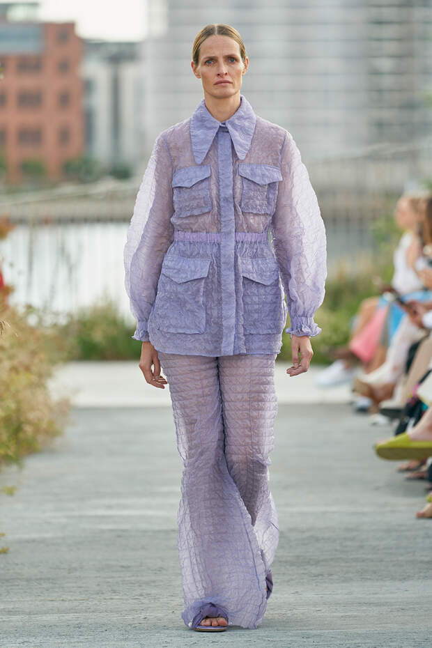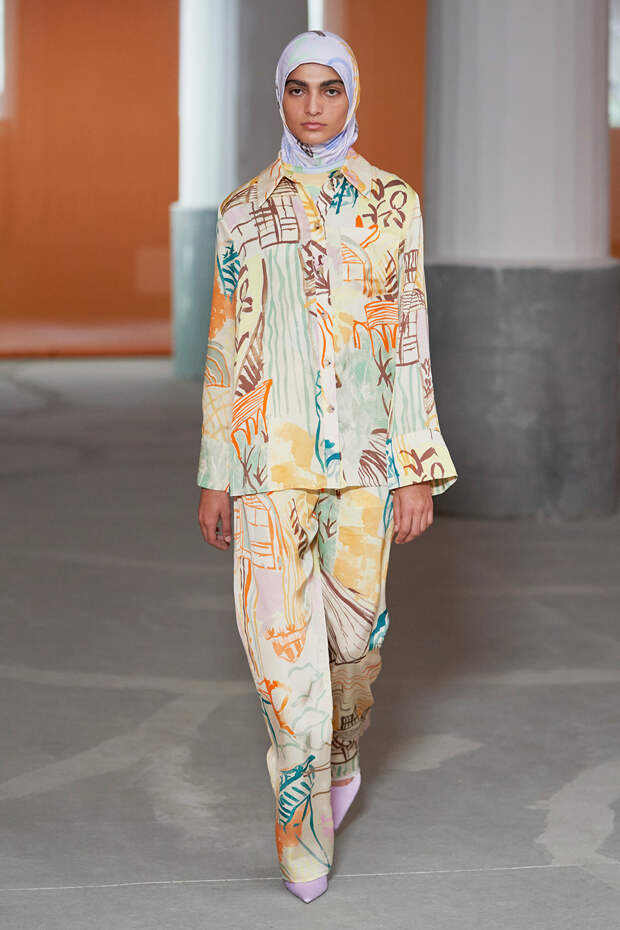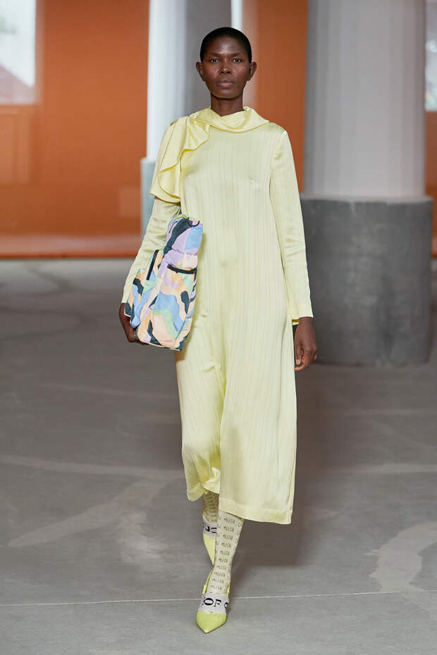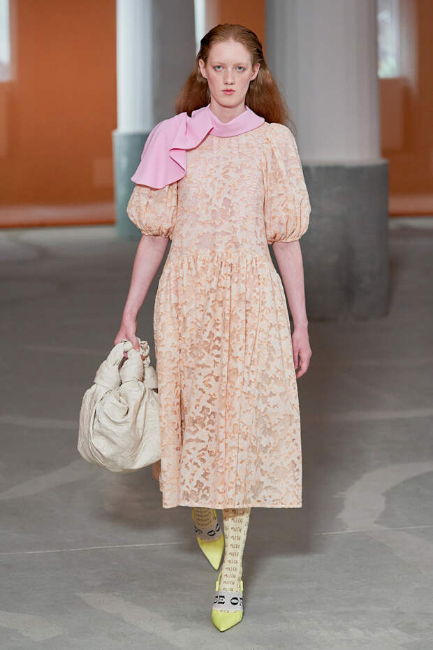 Ganni уже с трудом можно назвать локальным брендом: на его счету два успешных сотрудничества с Levi's, работа с лучшими мультибрендами по всему миру и суперзвезды вроде Рианны и Бейонсе в рядах верных поклонниц. И, конечно, очень узнаваемый почерк: их блузки и платья с отложными воротничками трудно с чем-то спутать. При этом в новой коллекции нет ни этих самых воротничков, ни другого важного кода марки — леопардового принта. По словам креативного директора Дитте Реффстру, она вдохновилась тем, как ее клиентки развлекались неожиданными сочетаниями вещей, скучая во время локдауна. Поэтому в коллекции появились яркие «треники» с подвернутыми манжетами, коктейльные платья, надетые поверх рубашек (и с «мужским» жакетом сверху!) и, конечно, главная постпандемийная обувь, которую теперь носят со всем и под все: клоги.