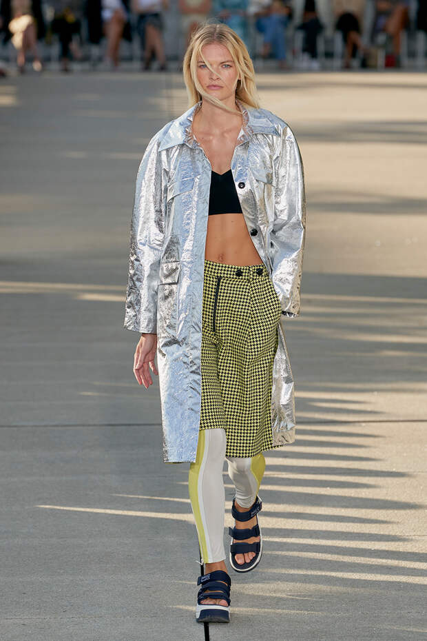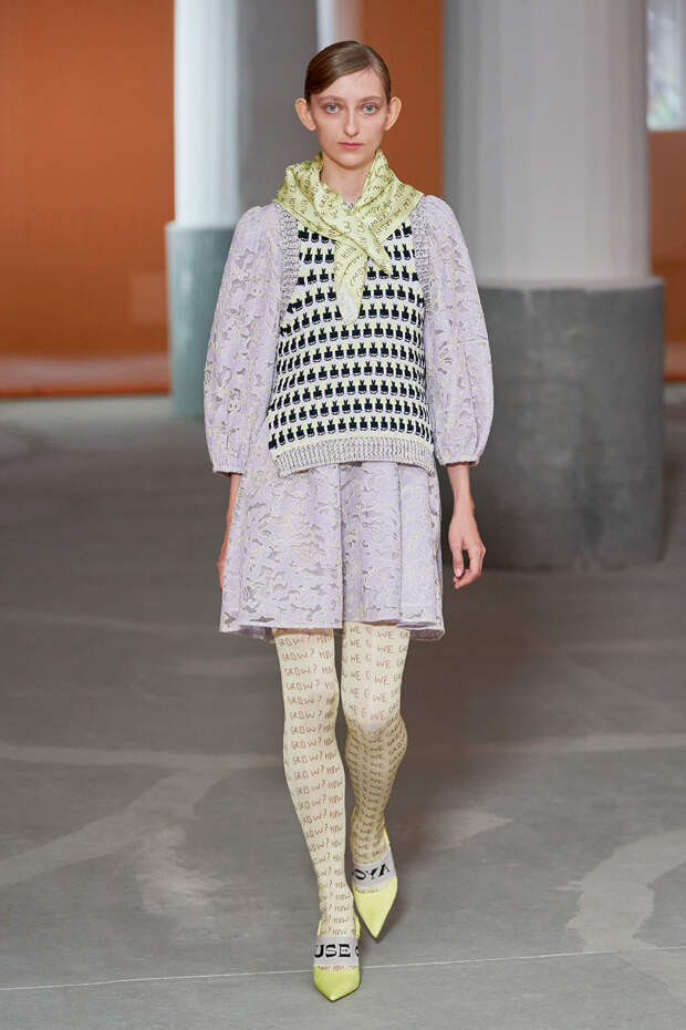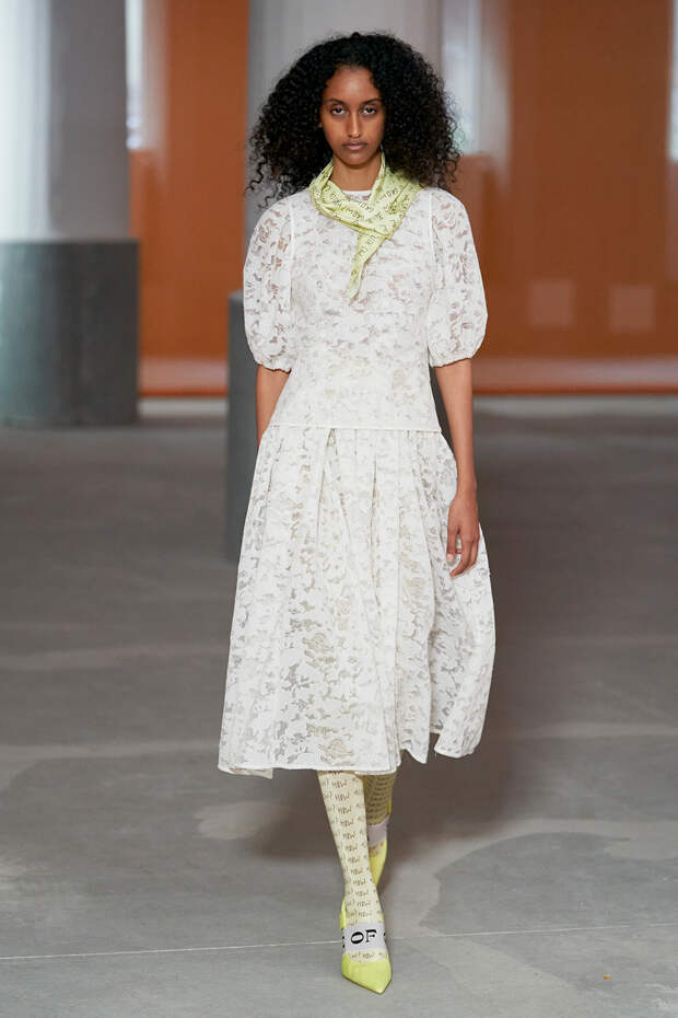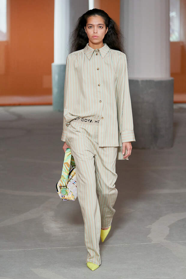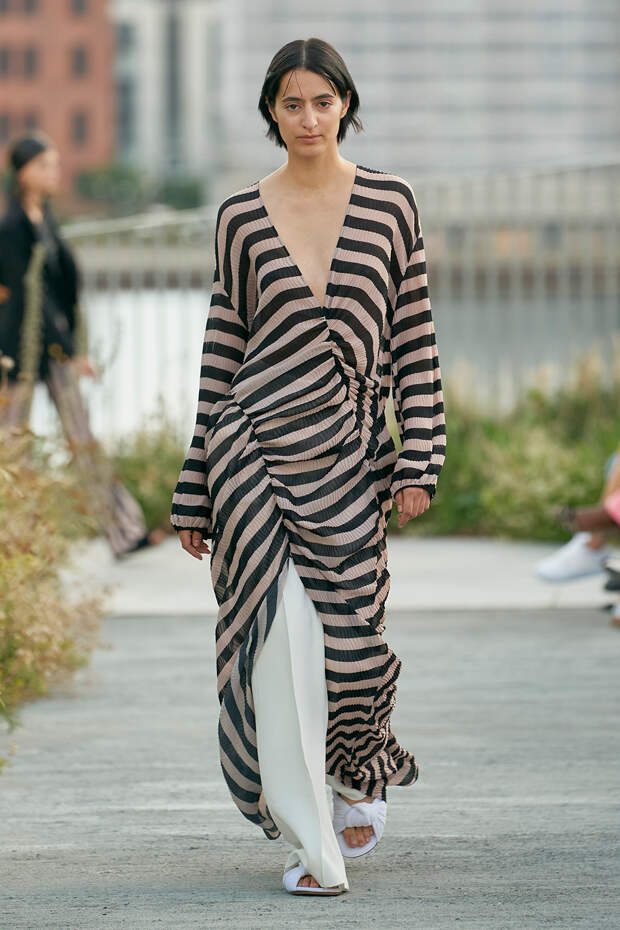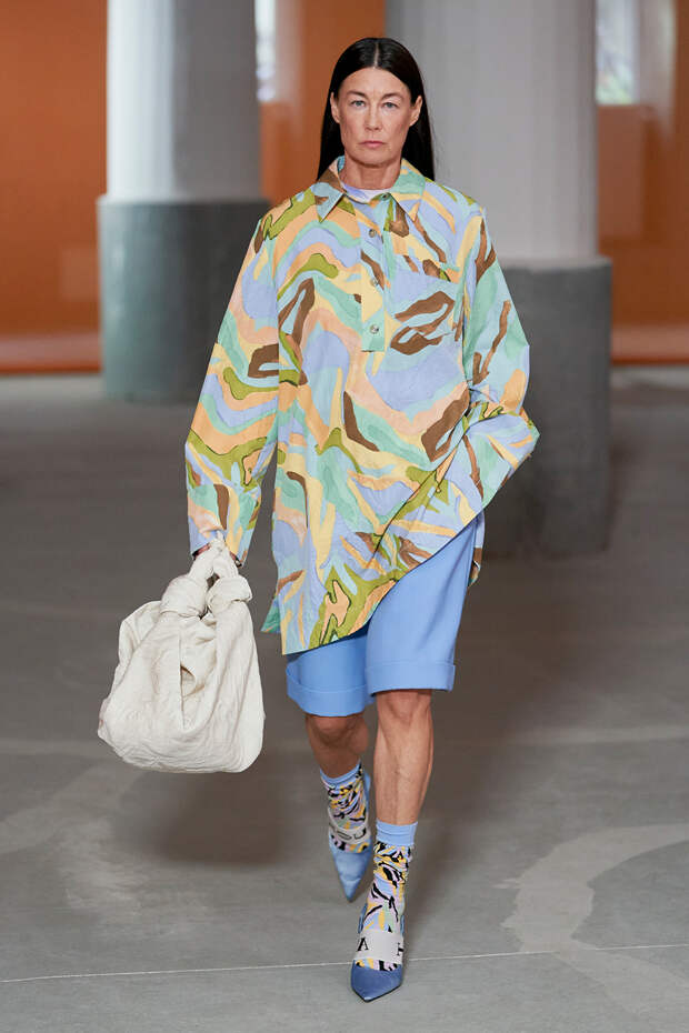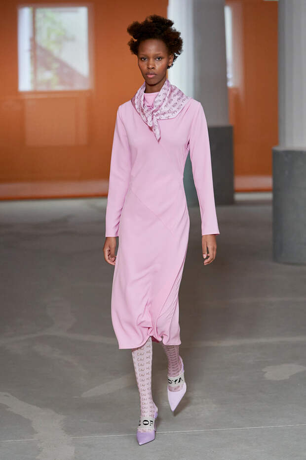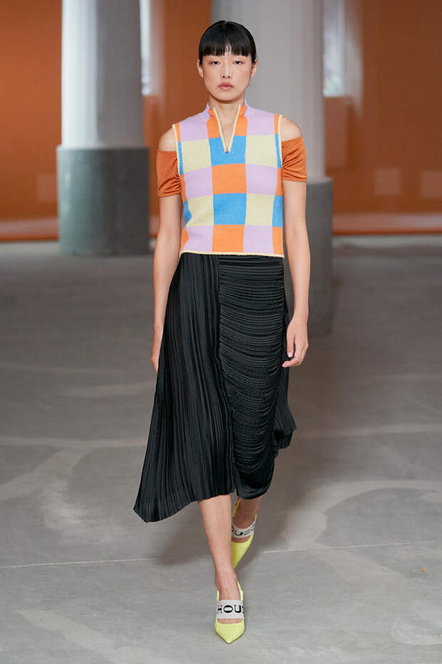 Ganni уже с трудом можно назвать локальным брендом: на его счету два успешных сотрудничества с Levi's, работа с лучшими мультибрендами по всему миру и суперзвезды вроде Рианны и Бейонсе в рядах верных поклонниц. И, конечно, очень узнаваемый почерк: их блузки и платья с отложными воротничками трудно с чем-то спутать. При этом в новой коллекции нет ни этих самых воротничков, ни другого важного кода марки — леопардового принта. По словам креативного директора Дитте Реффстру, она вдохновилась тем, как ее клиентки развлекались неожиданными сочетаниями вещей, скучая во время локдауна. Поэтому в коллекции появились яркие «треники» с подвернутыми манжетами, коктейльные платья, надетые поверх рубашек (и с «мужским» жакетом сверху!) и, конечно, главная постпандемийная обувь, которую теперь носят со всем и под все: клоги.