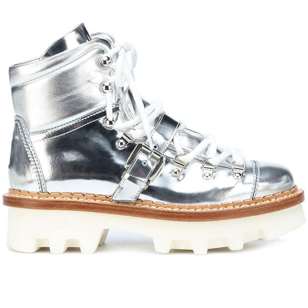 Стоит подобрать ботинки с высокой, плотной и ребристой подошвой. Во-первых, такая меньше других подвержена скольжению, а во-вторых, не допускает намокания. Подобные ботинки обязательно подойдут к повседневному гардеробу, даже если чаще всего вы носите платья. Вспомните о том, что еще недавно модницы не признавали сочетание этого женственного предмета с кроссовками, а теперь оно привычно. Обратите внимание, например, на светлые модели из кожи или с минимумом деталей.