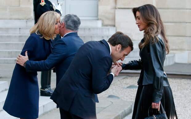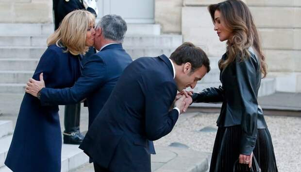 Хозяева Елисейского дворца радушно приняли гостей: президент Франции поцеловал королеве руку, а мадам Макрон обменялась с королем теплыми поцелуями в щеку.