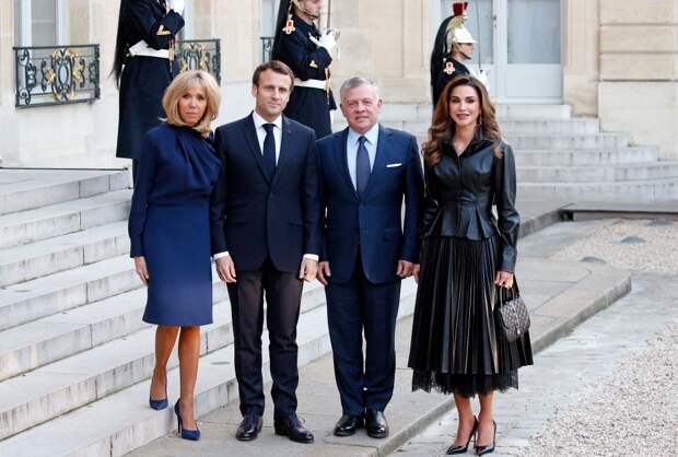 Королева Иордании Рания входит в список самых стильных представительниц современной монархии. И ее недавний выход – лишь очередное тому подтверждение. Для встречи с Эммануэлем и Брижит Макрон супруга короля Абдаллы II выбрала стильный комплект из экокожи в стиле 1950-х: приталенный черный жакет и плиссированную юбку с кружевной подкладкой.