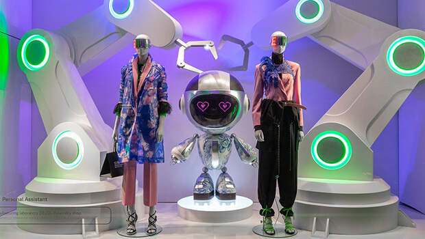 Вместе с весенне-летними моделями Balenciaga, Dries Van Noten, Balmain, Off-White, Raf Simons, Burberry, Gianvito Rossi, Jimmy Choo, Chloé и Dolce & Gabbana петербургский универмаг поместил в свои новые витрины роботов-помощников, украшенных в соответствии с трендами сезона.