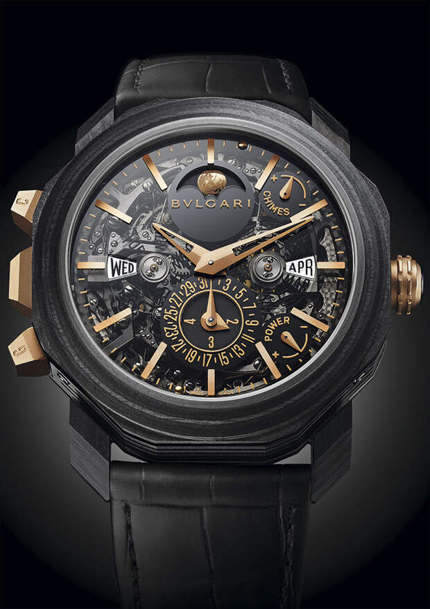 Другие громкие новинки бренда — сразу две новых мужских модели Octo. Octo Grande Sonnerie Perpetual Calendar выпущены в честь 25-летия первых часов с большим боем, разработанных Жеральдом Джента в 1994 году. Но особая гордость этого года для Bvlgari – это Octo Finissimo GMT Automatic. Механизм хронографа обладает невероятной тонкостью в 3,3 мм – это настоящий мировой рекорд.