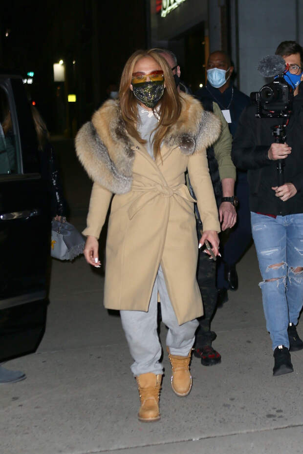 Джей Ло заправила свободные брюки в грубые ботинки на шнуровке. Тем не менее и здесь наша героиня не отказалась от своей любви к яркости: на ее обуви сияли праздничные стразы. На плечи Дженнифер накинула роскошное пальто с меховым воротником. Пальто с тонким поясом на талии - удачная альтернатива "дутым" пуховикам и кожаным дубленкам. Даже защитную маску звезда выбрала с переливами, а огромные фантазийные цветные солнцезащитные очки удачно вписались в общую концепцию. Певица уложила свои волосы голливудскими локонами - и в очередной раз доказала статус дивы, попав в объективы папарацци на улицах города.