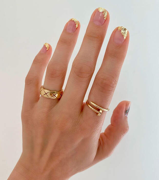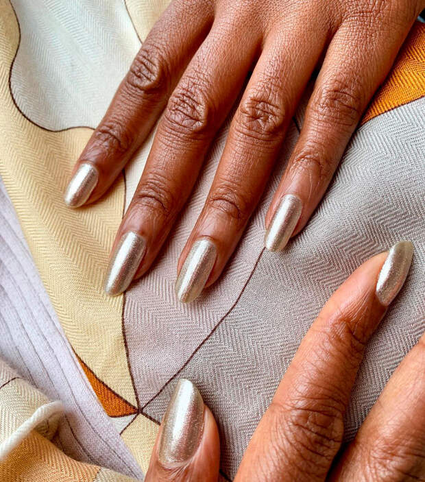 Металлические оттенки, которые мы часто привыкли видеть в новогодние праздники, теперь стали одними из ключевых в осенней палитре-2020. Если уж и надевать сияющие золотистые и серебряные наряды осенью, то и маникюр можно сделать подходящий - полностью покрыть ногтевую пластину переливающимся лаком, сделать вставки на матовом фоне или золотой френч с нейтральной основой.