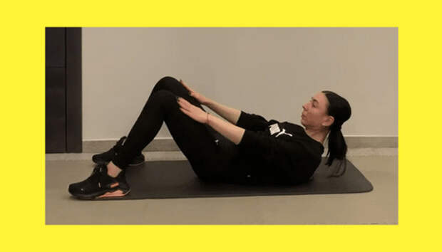 На выдохе за счет мышц живота выполните подъем корпуса до нижнего края лопаток и на вдохе плавно вернитесь в исходное положение.