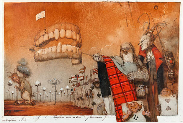 Читать "Алису", уверен автор издания Кирилл Чёлушкин, надо исключительно на английском – в переводе совершенно теряется тонкий юмор и вся красота истории Кэрролла. Язык изобразительного искусства, к счастью, универсален: вся суть и прелесть Alice's Adventures in Wonderland — в хулиганских иллюстрациях Кирилла и кропотливой работе, которая стоит за каждым экземпляром. Все они уникальны благодаря ручной прошивке переплета и окраске обреза — дарить только большим ценителям!