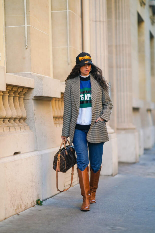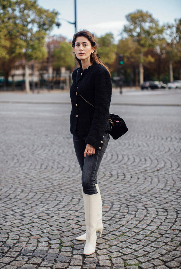Сочетание джинсов с высокими сапогами, как мы знаем, — очень рискованное. Что называется, на грани. Здесь есть только два варианта развития событий. Либо в конечном итоге вы будете выглядеть ультрамодно, либо отправитесь прямиком в нулевые — в плохом смысле этого слова (все же помнят весьма спорные луки знаменитостей того времени?