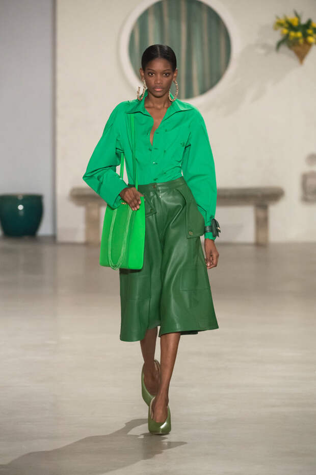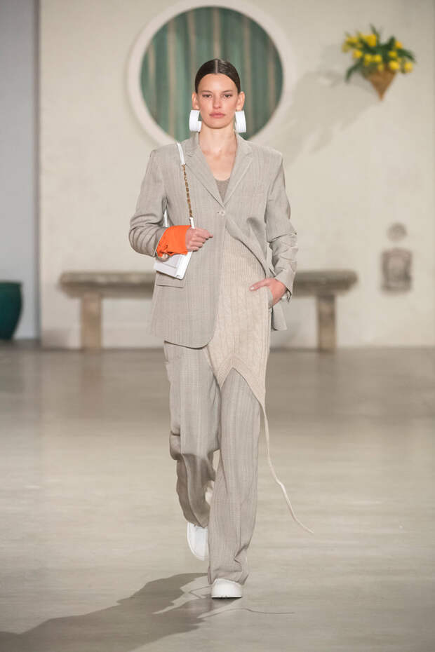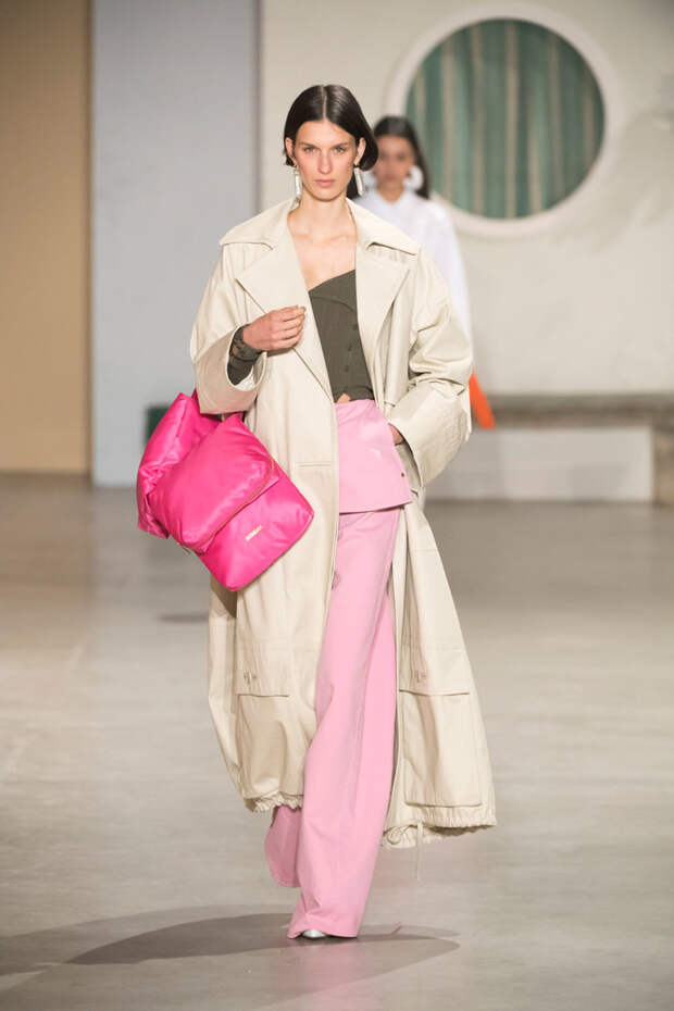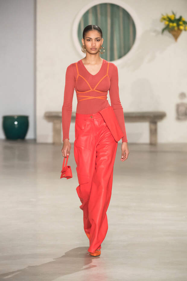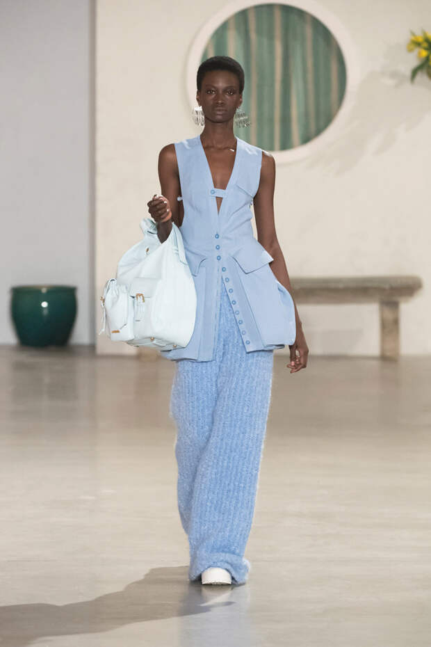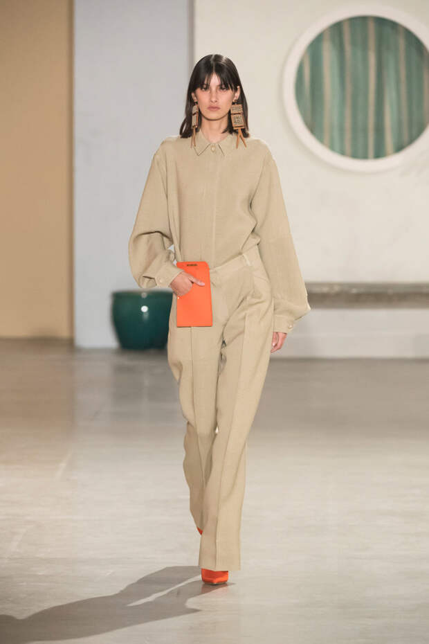 Ткани на показах Жакмюса еще никогда не было так много — ощущение непривычное. Открытые платья, которые на теле держатся благодаря телесным изгибам и тонким веревочкам, уступили место брючным костюмам — чуть более свободным, чтобы их можно было назвать классическими, но для работы вполне подходящим. Как и кожаные кюлоты, широкие трикотажные брюки, длинные теплые платья. А одной из главных деталей стали огромные карманы, иногда закрепленные на съемных поясах, — что это, как не отсылка к рабочей, униформенной одежде? И это на показе Жакмюса, который был синонимом вечного праздника? Чудные дела.