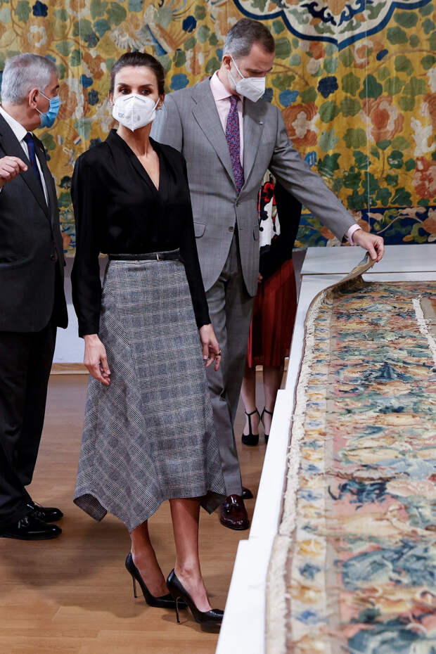 Королева Испании часто появляется на протокольных мероприятиях, где нужно выглядеть соответствующим образом. Поэтому с нее безусловно можно брать пример в части того, как одеться на работу. Во время недавнего совместного выхода с королем Фелипе Летиция выбрала образ, который куда оригинальнее большинства офисных луков — но при этом все еще остается уместным. Изящную черную шелковую блузку с v-образным вырезом она дополнила серой асимметричной юбкой-миди А-силуэта в мелкую клетку. Завершающей деталью стали классические черные лодочки на шпильке — любимая обувь королевы, универсальная и уместная в любой ситуации. Так что офисный стиль — это не только "белыый верх — черный низ", но и что-то более изящное и актуальное.