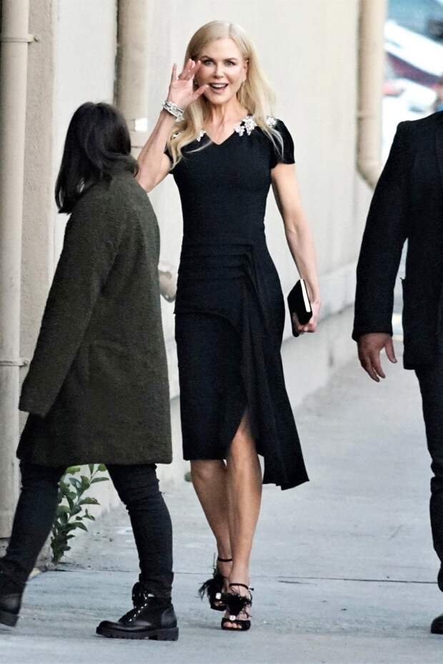 51-летняя Николь Кидман с ее точеной фигурой может позволить себе любые образы, на которые не все осмелятся в ее возрасте. Актриса отправилась на шоу Джимми Киммела и решила подчеркнуть свои изгибы при помощи облегающего черного платья с кружевом на плечах и смелым высоким разрезом. Дополнили образ Николь босоножки на ремешках с кокетливыми перьями, и, така как супруг Кит Урбан не смог составить е компанию, Кидман захватила с собой "лучших друзей девушек" — браслеты и серьги с бриллиантами.