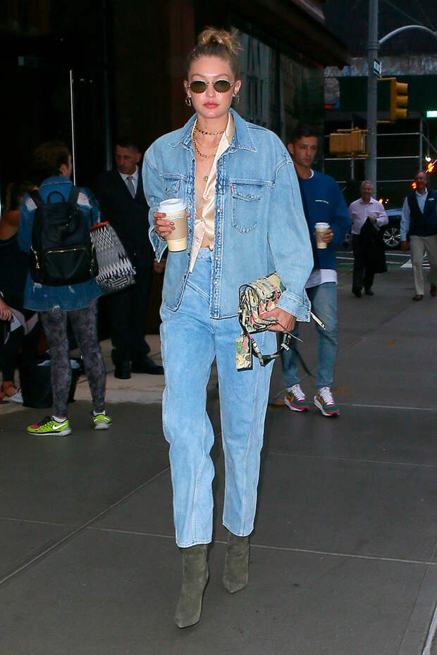 Деним в новом сезоне не фигурирует как главный материал. Но Джиджи Хадид не следит за трендами, а создает их. Поэтому супермодель носит тотал-луки из любимой джинсы, не теряя звания иконы стиля. Все дело в деталях: атласная блузка в стиле 70-х узлом на животе и замшевые ботильоны на каблуках. В таком виде Джиджи отправилась на матч US Open с участием ее подруги Серены Уиллиамс.