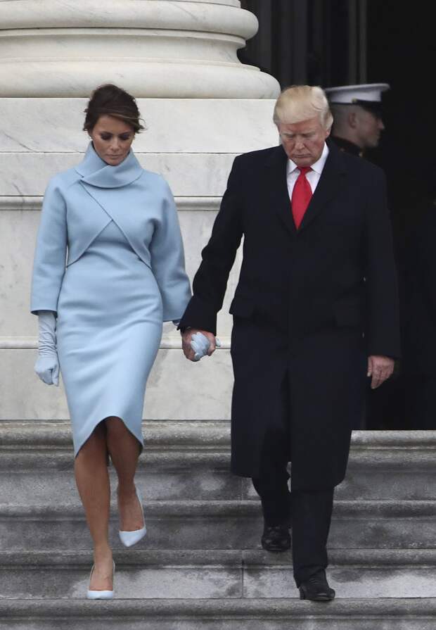 Голубой костюм Ralph Lauren с перчатками и остроносыми лодочками в тон первая леди и бывшая модель надела по случаю инаугурации Дональда Трампа в 2016-м году. И хотя все единогласно признали, что нежный оттенок и облегающий силуэт Мелании были очень к лицу, без скандала тут снова не обошлось. Образ был явной отсылкой к одному из выходов Жаклин Кеннеди-Онассис — вечной любимицы американцев и эталону первой леди. Правда, стилист госпожи Трамп несколько просчитался. Как выяснилось, костюм Джеки О не был голубым — его исказила пленка, использованная в телевизионной записи. На самом деле он был белым. Так что госпоже Трамп снова досталось — не только за косплей кумира миллионов, но и за плохой рисерч.