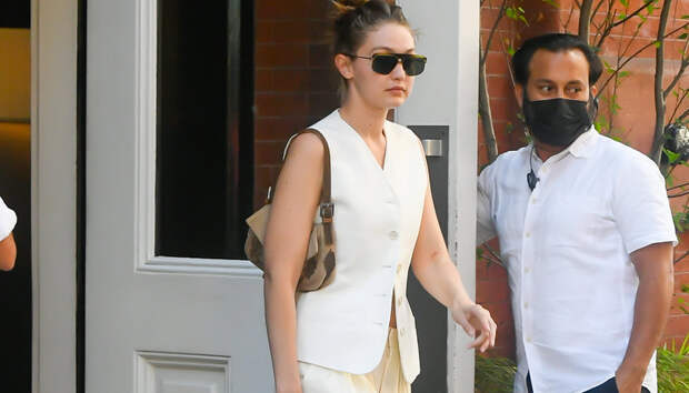 Модель и молодая мама появилась на публике в тотал-луке нежного кремового оттенка: широких брюках с защипами на талии, жилете н пуговицах и кедах. Самой интересной деталью стал жилет, ведь девушка застегнула его не на все пуговицы, а лишь на одну. Возьмите этот прием на заметку: он поможет оживить даже самый базовый и простой лук. Завершила образ сумочка-багет красивого оттенка кофе с молоком, которую Хадид надела на плечо.