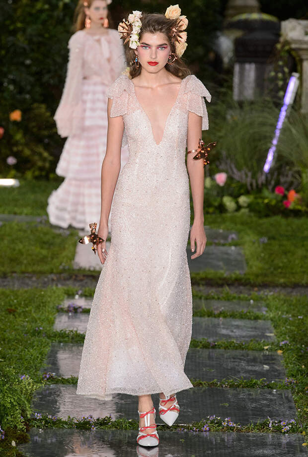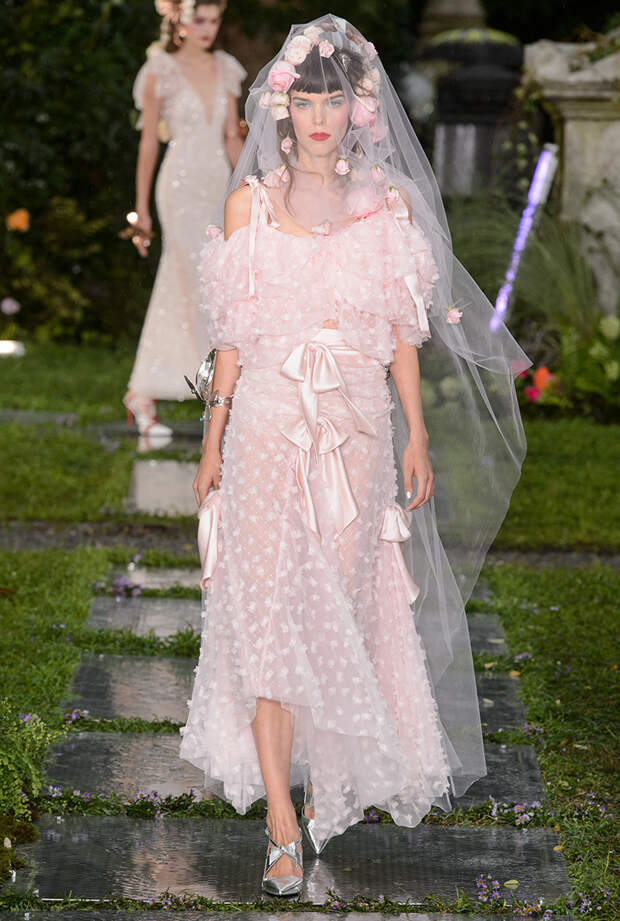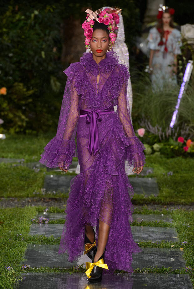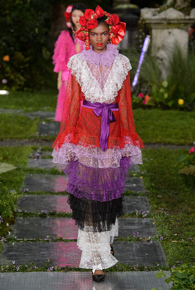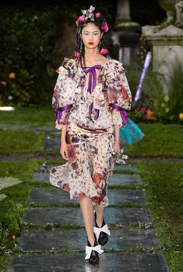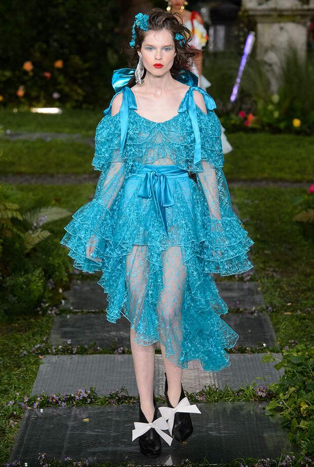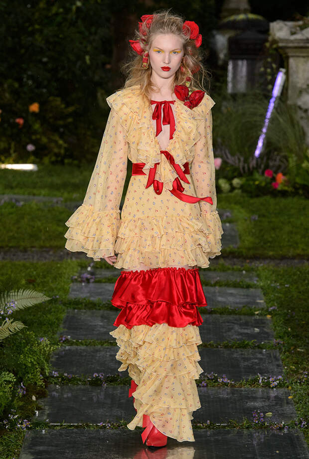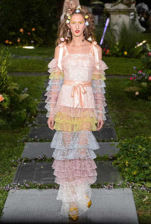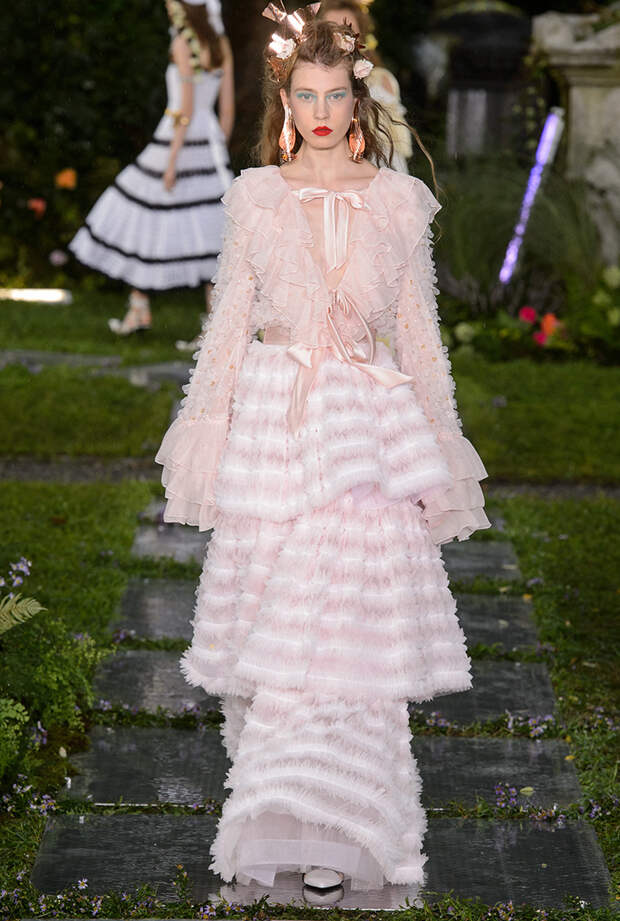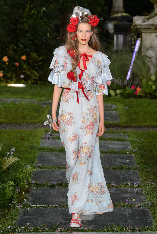На подиуме разворачивалось поистине сказочное действо: модели, облаченные в королевские одеяния будто из прошлой эпохи, медленно шествовали мимо гостей.Бесконечные оборки, шелковые ленты, цветочные рисунки и нашивки, кружево, фатин, пышные юбки и обилие бантов – от таких платьев наверняка не отказались бы королевы и императрицы средневековья. Но и современные девушки, без сомнений, равнодушными при виде этой коллекции не останутся. В частности, предложенные Кейт и Лаурой вещи идеально подойдут для бракосочетания. Ведь если у большинства модельеров выход невесты обычно приберегается для финала показа, то здесь таких образов было большинство.