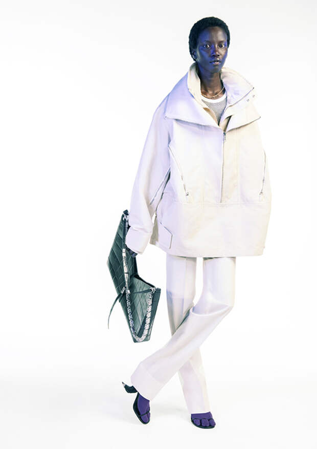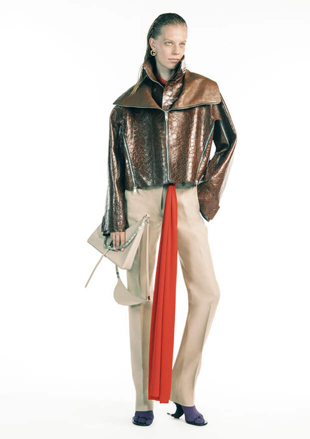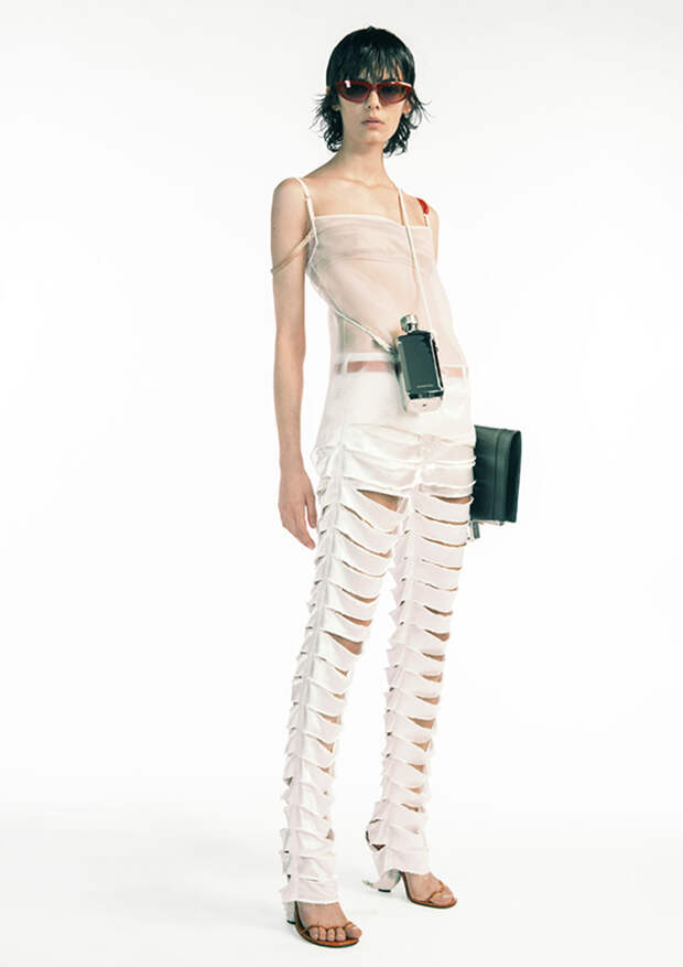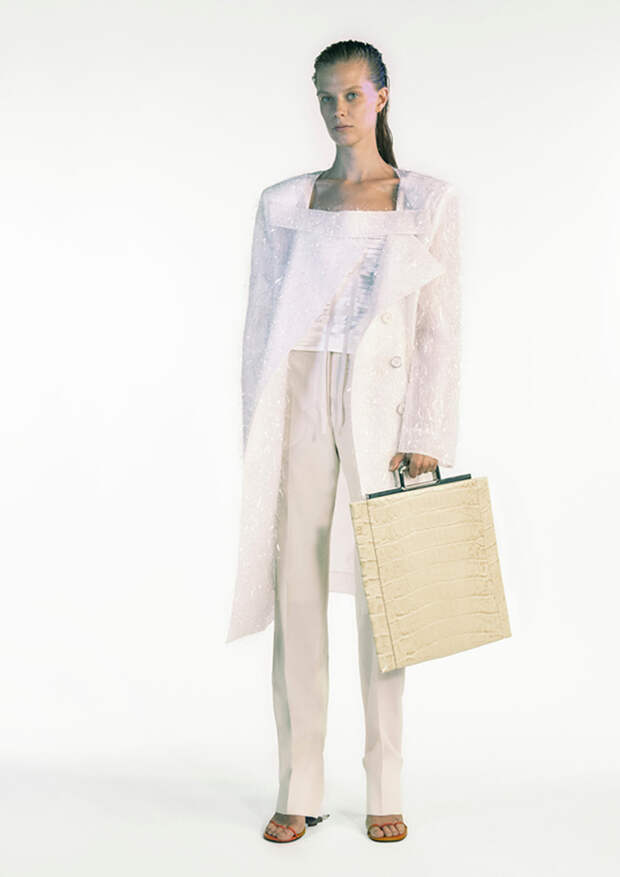 Никаких затянутых мини-фильмов и традиционного показа — только кадры из лукбука. Сейчас, когда дизайнеры наперебой пытаются изобрести велосипед и показать новую коллекцию как-то необычно, подобная немногословность уже сама по себе привлекает внимание.И, наконец, сама одежда. Без — сюрприз — каких-то особых отсылок к стритвиру. Впрочем, сам Уильямс уже долгое время всячески пытается дистанцировать себя и свой бренд от этого термина. Вместо этого он делает большой упор на технологии. В коллекции им тоже нашлось место. Брюки выглядят так, будто они покрылись ледяной коркой, которая уже начала трескаться, а бежевое вечернее платье издалека напоминает бандажное (помните бренд Hervé Leger из нулевых?), но при ближайшем рассмотрении оказывается сложным образом скроенным из тонких горизонтальных полосок ткани. Практически не оказалось в коллекции и ожидаемой логомании — лишь пара скромных лого на сумках. Зато в избытке было замков, которые Уильямс, по его собственному признанию, намерен использовать вместо логотипов и сделать такими же узнаваемыми. Они были вдохновлены старой романтичной парижской традицией — туристы оставляют их на мосту в память о поездке, а ключи выбрасывают в Сену. Они используются в коллекции и как фурнитура на одежде и аксессуарах (особенно оригинально смотрится такая застежка на черном мужском пальто), и как самостоятельные украшения — например, серьги. Уже упомянутые рога из кутюра авторства Александра Маккуина помимо обуви появились еще и на кепках. А в своем исследовании архивов Дома Мэтью Уильямс не стал ограничиваться лишь "британским периодом": отсылки к самому основателю в коллекции тоже имеются. Например, острые, гипертрофированные плечи — известно, что Юбер де Живанши именно этой части силуэта уделял особенное внимание. Интересно, что их эффект в жакетах достигается не подплечниками, а вертикальными прямоугольными панелями ткани на рукавах — довольно непривычное, но очень эффектное решение.
