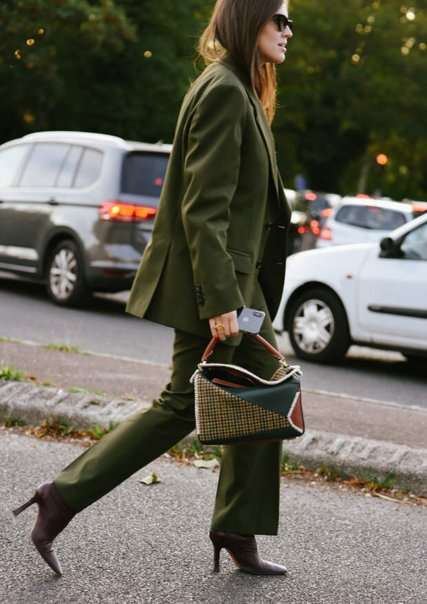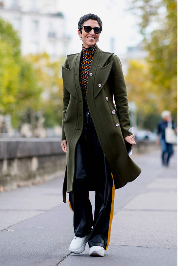МИКСУЙТЕ разные оттенки – от светло-бежевого до болотно-зеленого. ИГРАЙТЕ со стилями: с милитари-пальто сочетайте спортивные брюки с лампасами, а с генеральским галифе – уютный вязаный топ. ПОДЧЕРКНИТЕ талию экстремально длинным поясом, добавьте остроносые ботильоны и крупные очки.