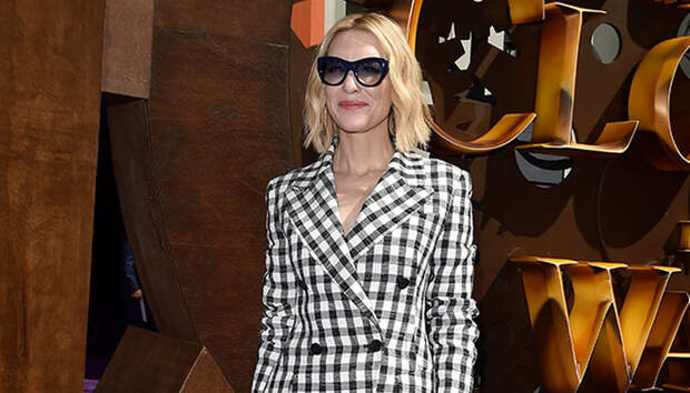 На премьере в Лос-Анджелесе Кейт, которая сыграла добрую ведьму, появилась в брючном костюме в черно-белую клетку с брюками клеш. Идеальный вариант современной классики.