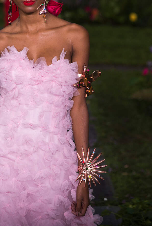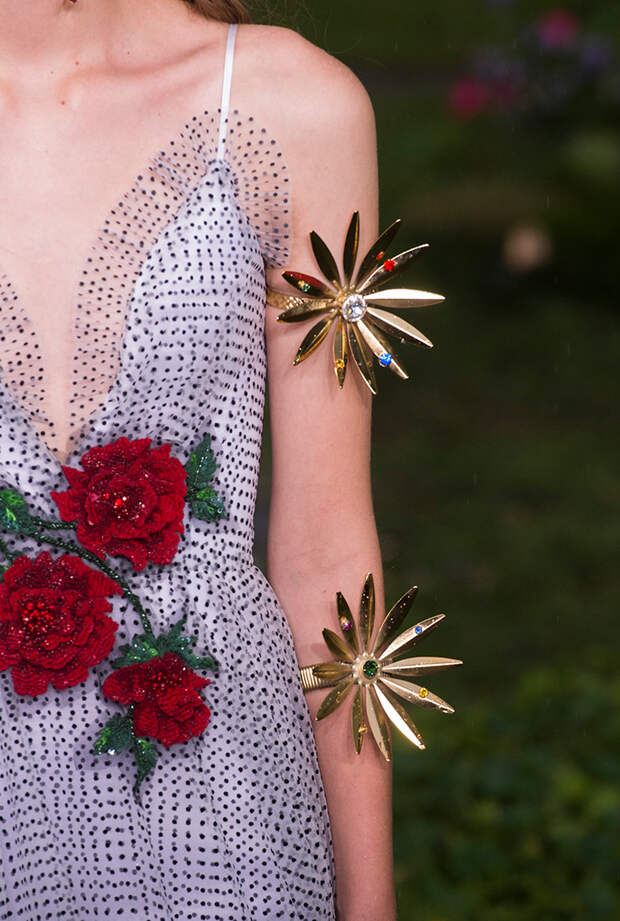 Аксессуары с весенне-летнего показа Rodarte заслуживают не меньшего внимания, чем платья, ведь над ними сестры Малливи тоже как следует потрудились. Практически к каждому образу прилагалось украшение из серебристого или золотистого металла: в виде цветков, птиц, волн и абстрактных фигур. Браслеты, серьги, колье и ободки были инкрустированы цветными камнями и прекрасно дополняли наряды из новой коллекции.
