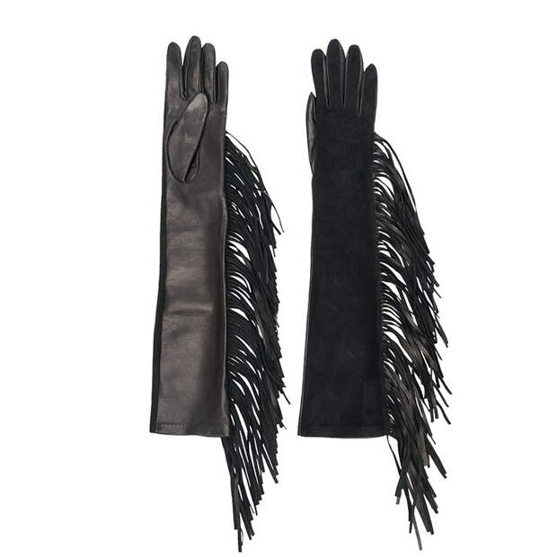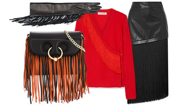 Если не можете определиться с выбором, отдайте предпочтение черному тотал-луку в сочетании с кожей и бахромой — не прогадаете. Не бойтесь сочетать этот тренд с другими. Например, выгодной покупкой станет юбка-карандаш, рюкзак цвета металлик, однотонный total look — и все это с бахромой.