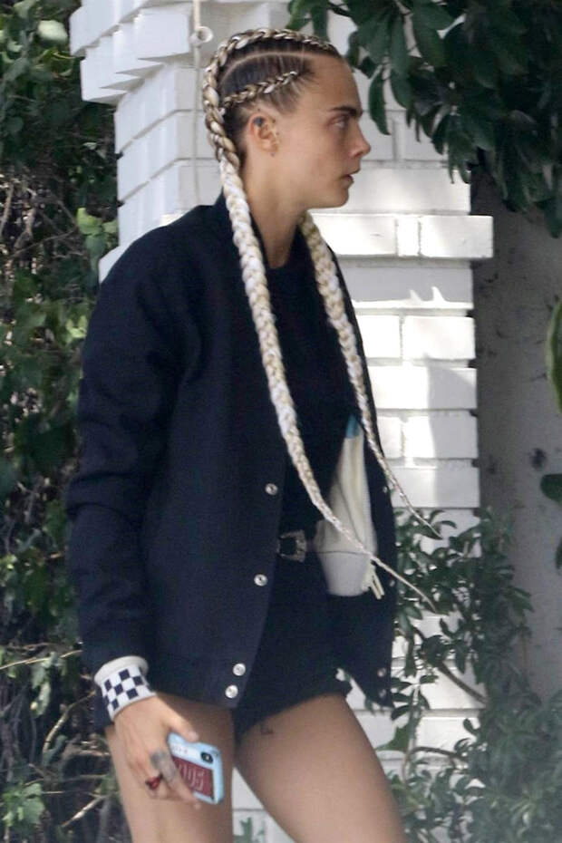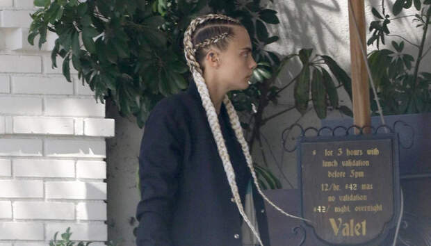 Но, видимо, модели самой непривычно обходиться без экспериментов, потому что очередной смены образа долго ждать на пришлось.В среду папарацци застали Делевинь в Лос-Анджелесе с новой прической — двумя длинными белыми косами почти до пояса. Модель вернулась к своему любимому цвету в одежде — выбрала черный тотал-лук из коротких шорт, куртки и футболки. Возможно, короткие волосы были вынужденной мерой — в последних рекламных кампаниях (например, Puma или Armani Exchange) она появлялась и с каре, и со стрижкой под мальчика.