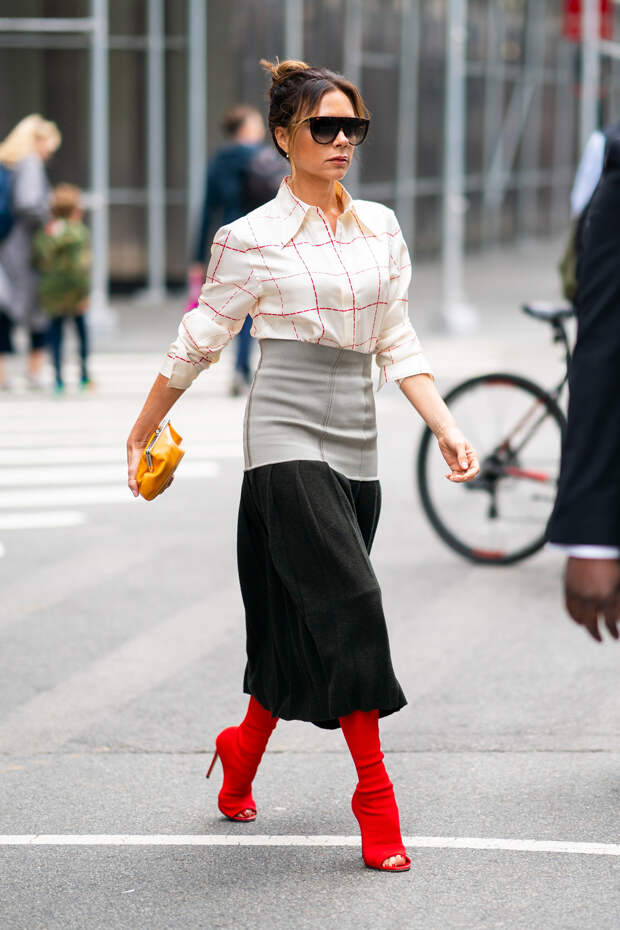 Повседневные образы Виктории Бекхэм можно разбирать на цитаты: укороченный свитер мятного цвета она носит в паре с красной рубашкой, поверх телесного боди набрасывает легкий тренч, а к скромному платью с длинным рукавом выбирает эффектные лодочками цвета фуксии. Предлагаем последовать примеру Вики и начать экспериментировать с самыми необычными сочетаниями материалов, форм и цветов.