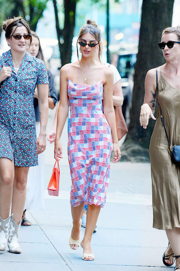 Папарацци Нью-Йорка дважды заметили Эмили Ратаковски в одном и том же трехцветном платье от Realisation Par. За два дня изменилась всего одна деталь, но за счет этого ощутимо изменилось настроение всего образа. Речь идет об обуви: сначала топ-модель надела минималистичные бежевые мюли на невысоком каблуке, а после переобулась в любимые белые кроссовки.