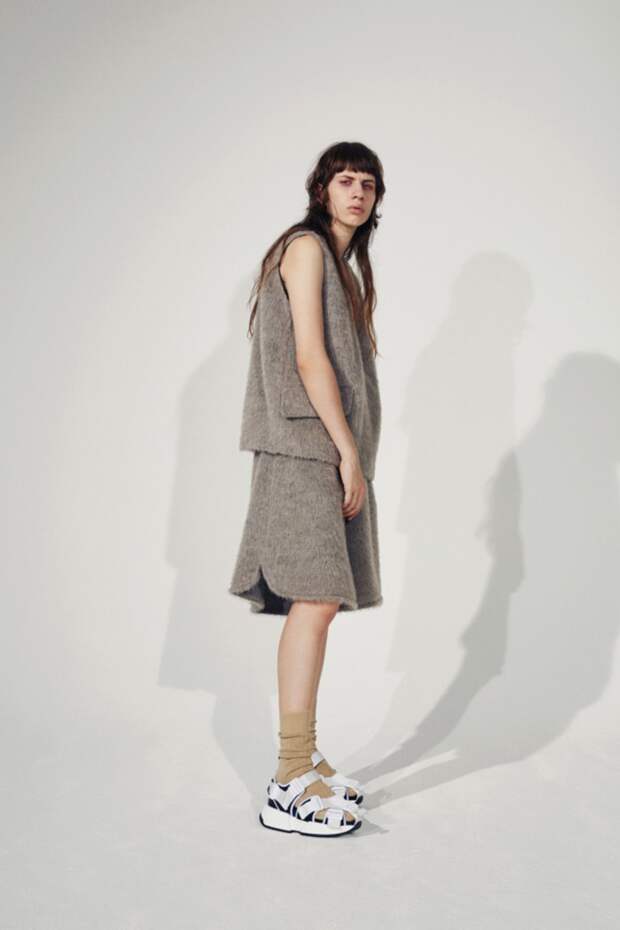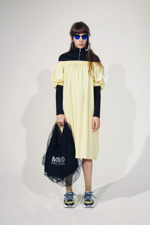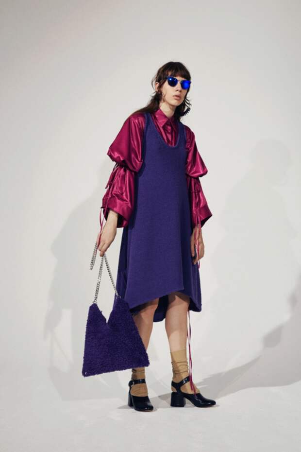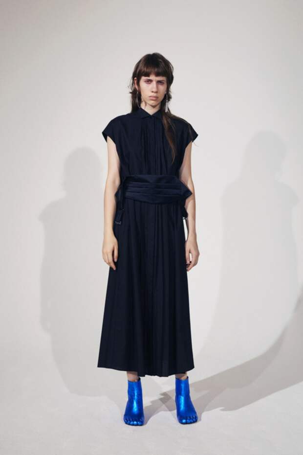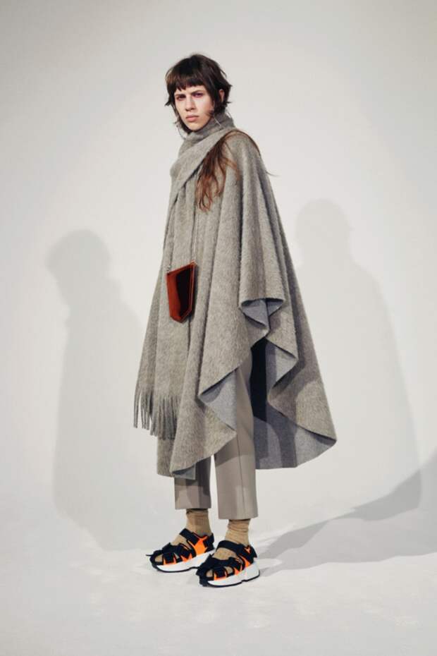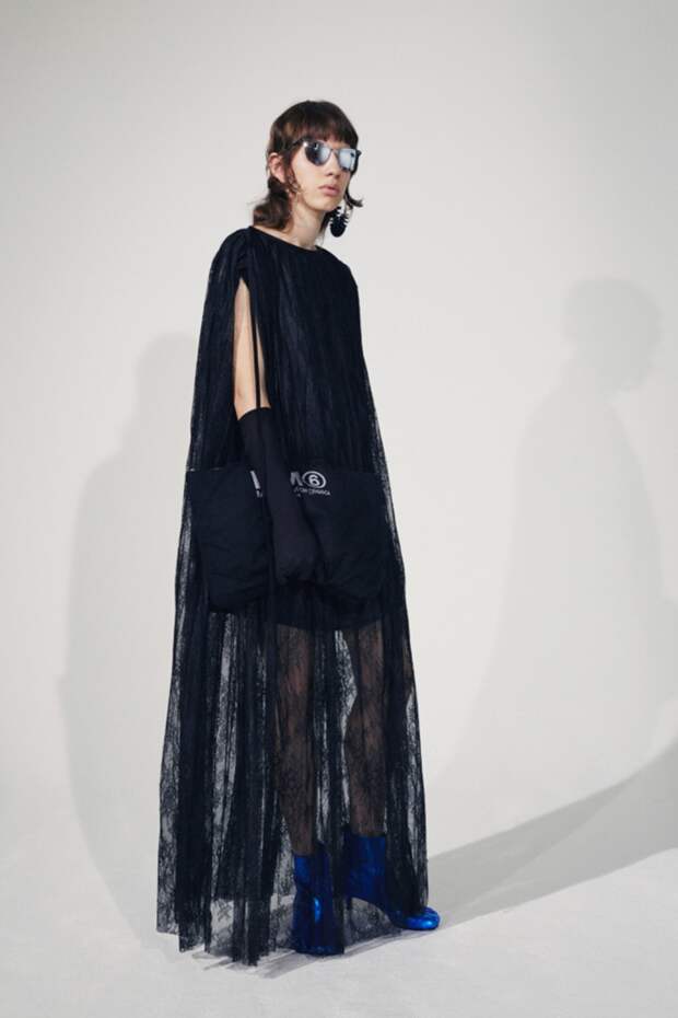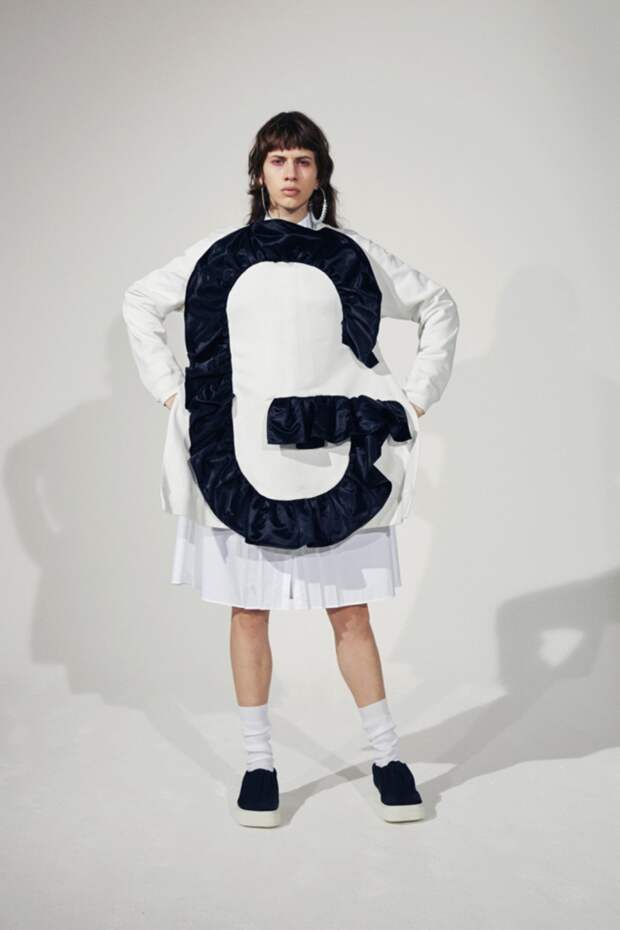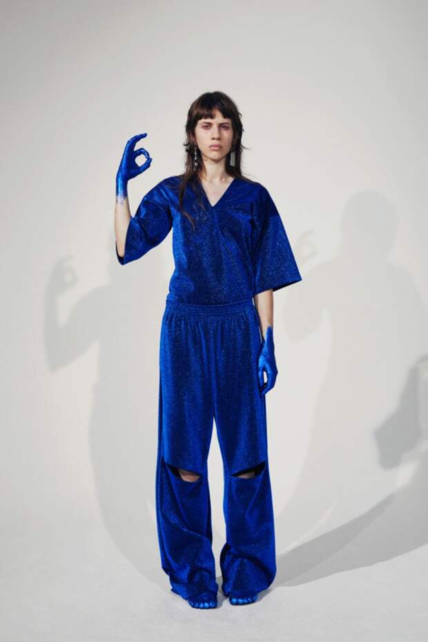 Зашифрованные послания, включая руку модели с синим глиттером в форме цифры 6, притаились на фоне ультрашироких брюк палаццо, многослойных юбок с секретом, жакетов с капюшоном в духе дождевика медвежонка Паддингтона, блуз с присборенными рукавами и причудливой обуви в духе японских таби, повторяющая форму пальцев на ногах.