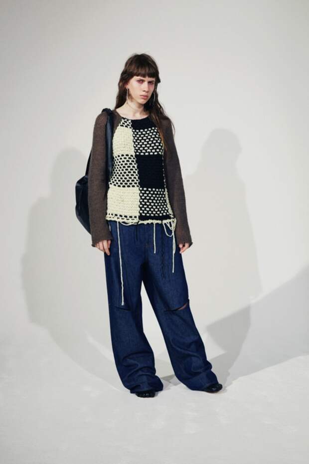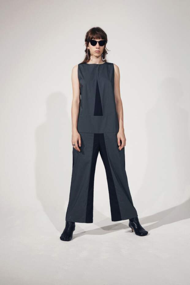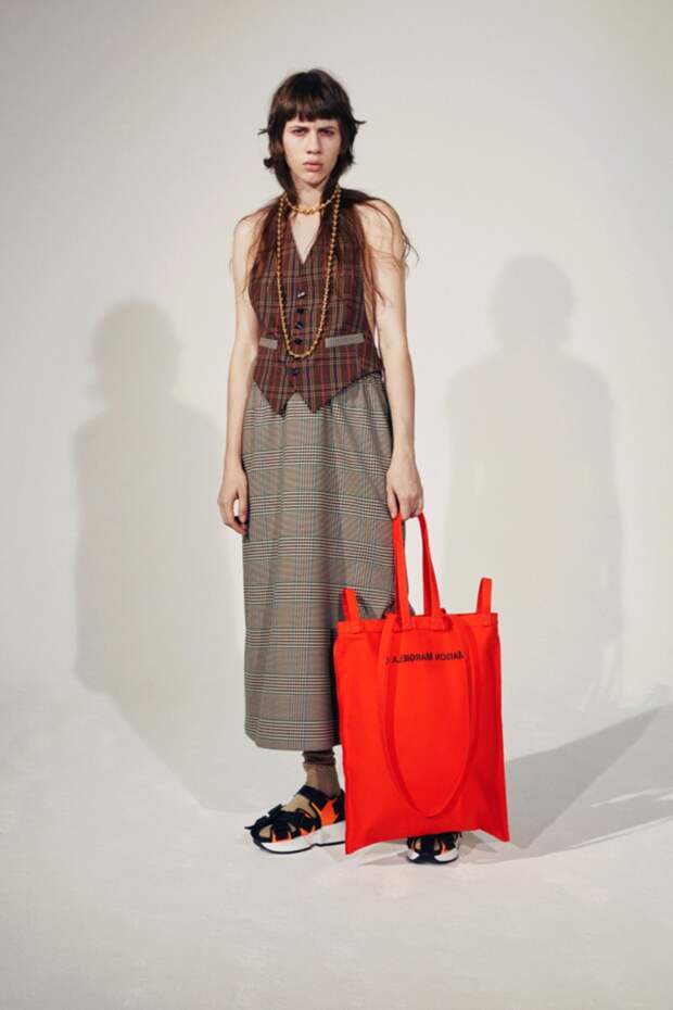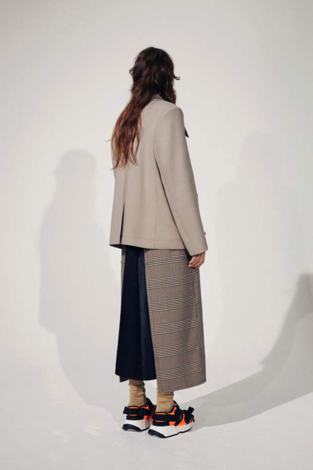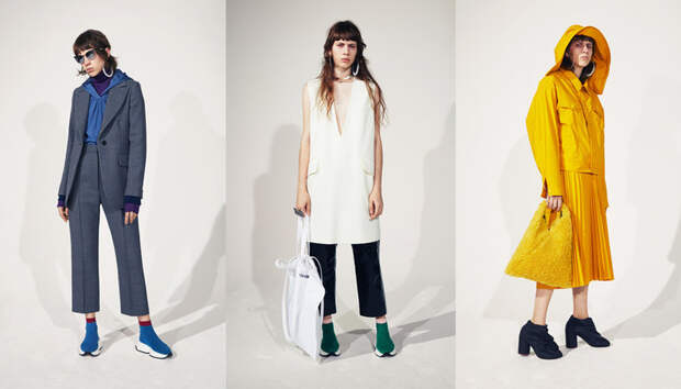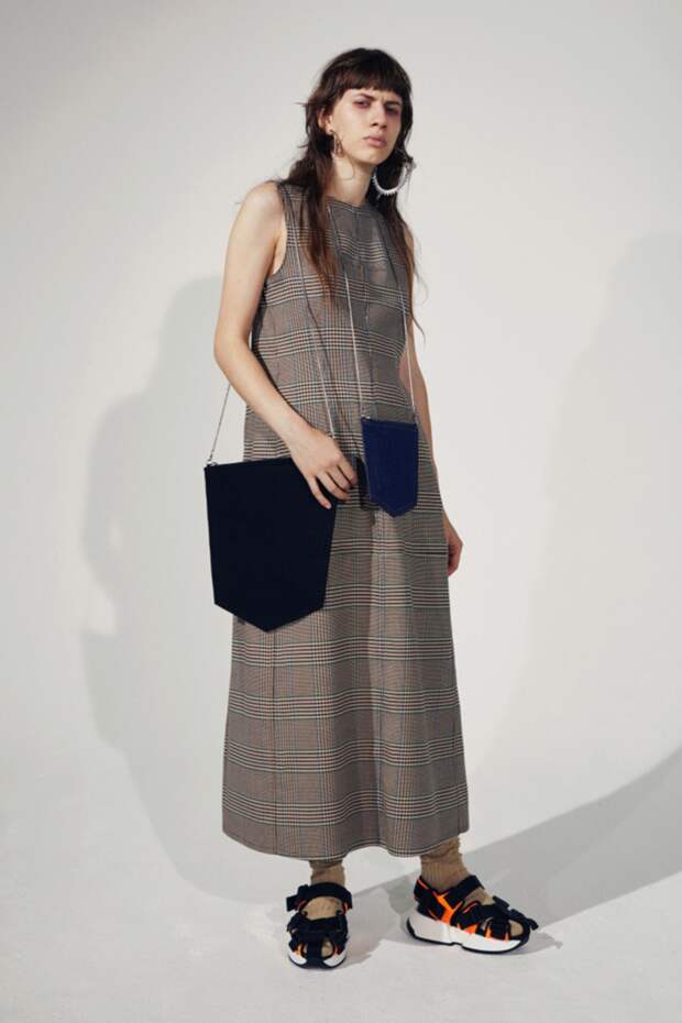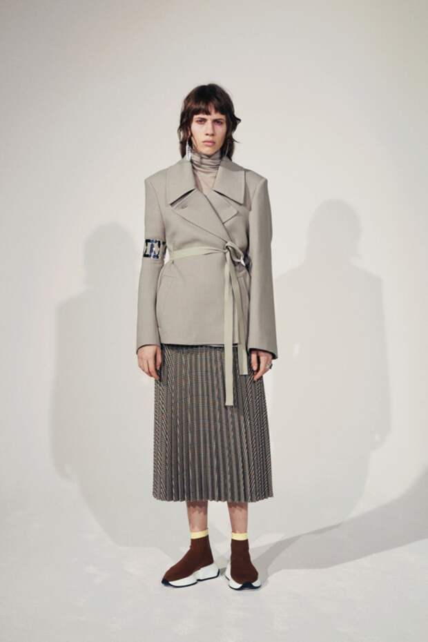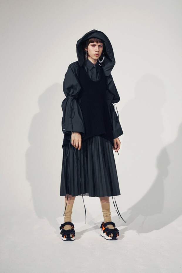 Зашифрованные послания, включая руку модели с синим глиттером в форме цифры 6, притаились на фоне ультрашироких брюк палаццо, многослойных юбок с секретом, жакетов с капюшоном в духе дождевика медвежонка Паддингтона, блуз с присборенными рукавами и причудливой обуви в духе японских таби, повторяющая форму пальцев на ногах.