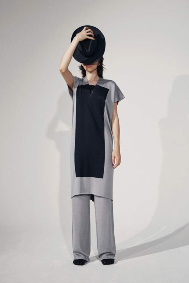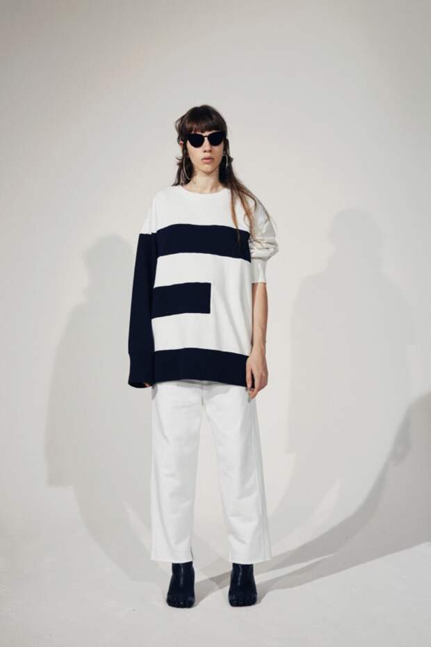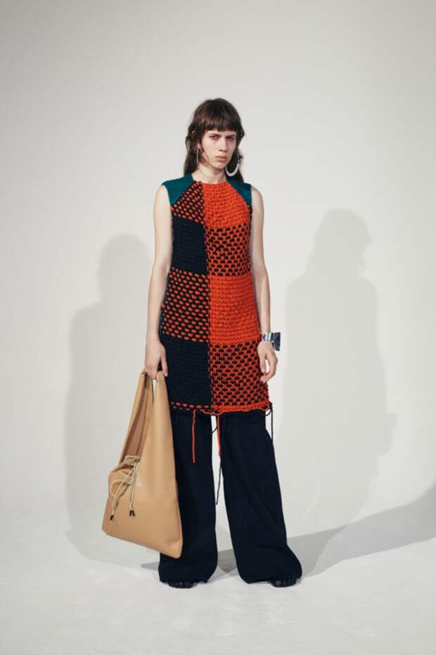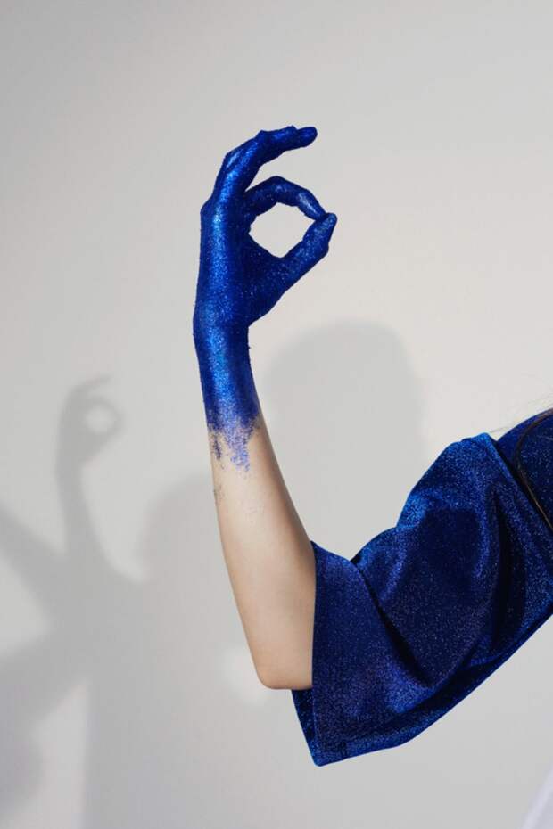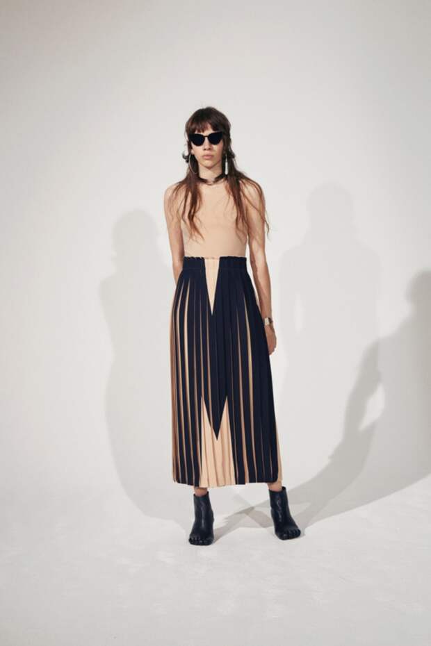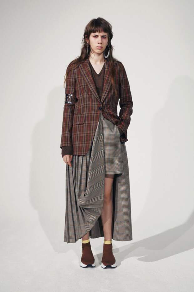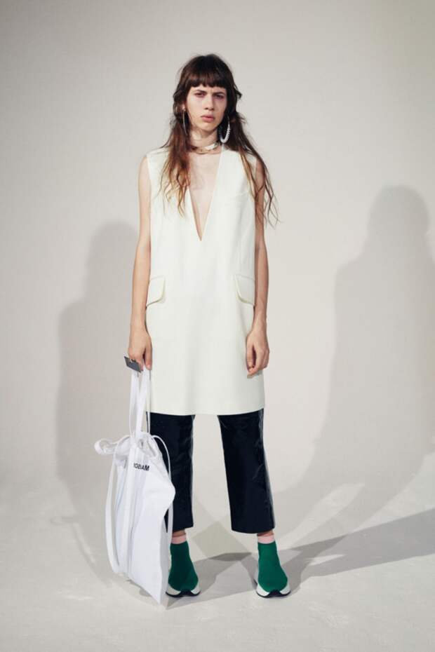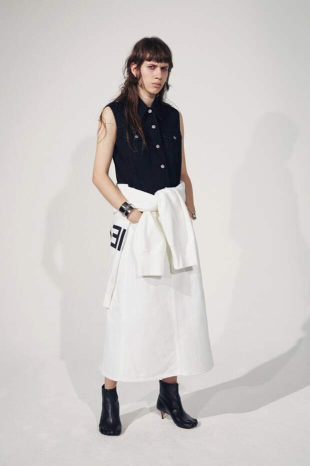 Зашифрованные послания, включая руку модели с синим глиттером в форме цифры 6, притаились на фоне ультрашироких брюк палаццо, многослойных юбок с секретом, жакетов с капюшоном в духе дождевика медвежонка Паддингтона, блуз с присборенными рукавами и причудливой обуви в духе японских таби, повторяющая форму пальцев на ногах.