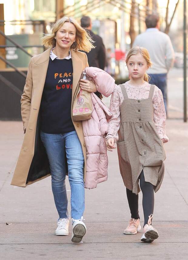К слову, одежда Уоттс тоже заслуживает внимания: актриса выбрала джемпер с говорящей надписью "Мир и любовь" — видимо, так Наоми обрисовала свою позицию по отношения к детям и их выбору.