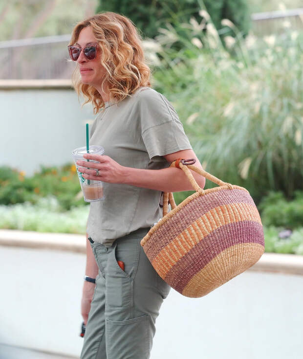 Если на красных дорожках Джулия Робертс любит привлекать к себе внимание и доказывать, что со времен выхода "Красотки" в 1990-м ее фигура мало изменилась, то в обычной жизни актриса модным трендам предпочитает комфорт. Впрочем, не без огонька — причем, в буквальном смысле. На днях Джулию, выходящую из кофейни с напитком, заметили папарацци: они запечатлели Робертс в пыльно-зеленой футболке и брюках в тон и оранжевых (или, если хотите, "огненных") биркенштоках.