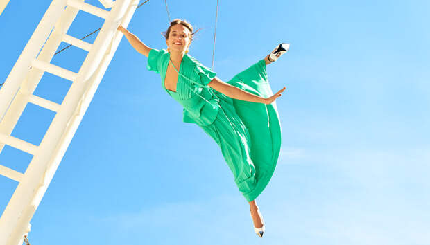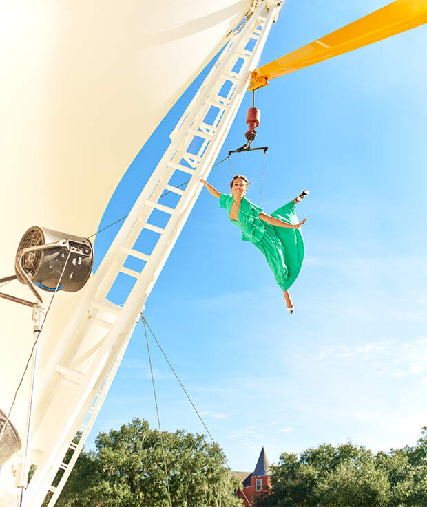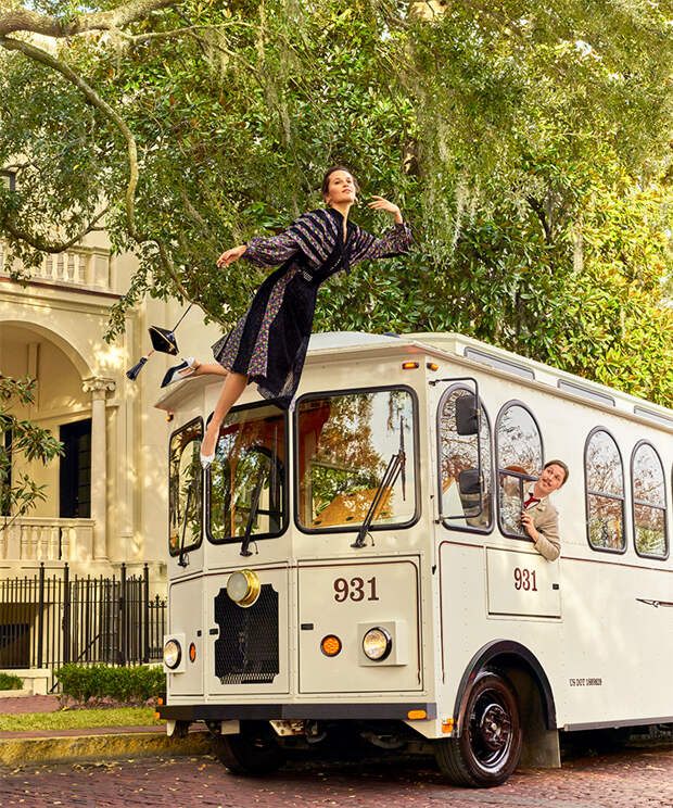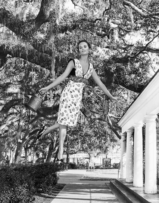 «Мам, я тоже так хочу!» – в парке Форсайт, что в Саванне, штат Джорджия, кучка малышей побросала мячики и лопатки и восхищенно смотрит вверх, как будто над ними пролетает супергерой. В принципе, так оно и есть: на съемке Bazaar Алисия Викандер в буквальном смысле витает в облаках.