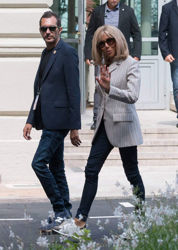 На днях Брижит прибыла на саммит G7, который в этом году принимает французский Биарриц: папарацци запечатлели ее на пути к отелю Palace, куда Макрон спешила в джинсах в облипку, кроссовках и сером блейзере в полоску. Надо признать, что это демократичный аутфит очень к лицу главной моднице Франции.