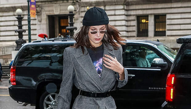 Полупрозрачные черные колготки моментально преобразят любой наряд до уровня femme fatale. Этот прием активно использует Белла Хадид. Тем более что погодка в Нью-Йорке шепчет. Супермодель носит их с серым пиджаком-платьем, носками и изящными ботильонами. И еще один важный аксессуар, на который нельзя не обратить внимание, - миниатюрная шапочка Беллы.