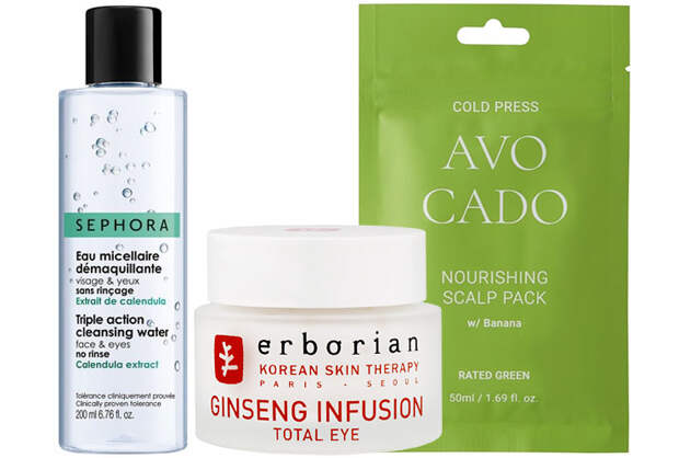 Моя бьюти рутина — это увлажняющий крем для лица и крем для области вокруг глаз с женьшенем от Erborian (использую его утром), мицеллярная вода для снятия макияжа Sephora и скраб для тела с маслом жожоба Cirkle.