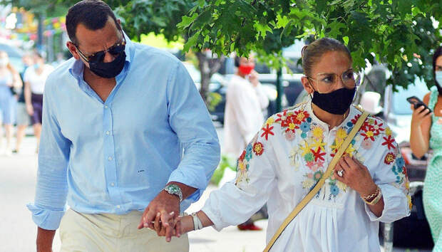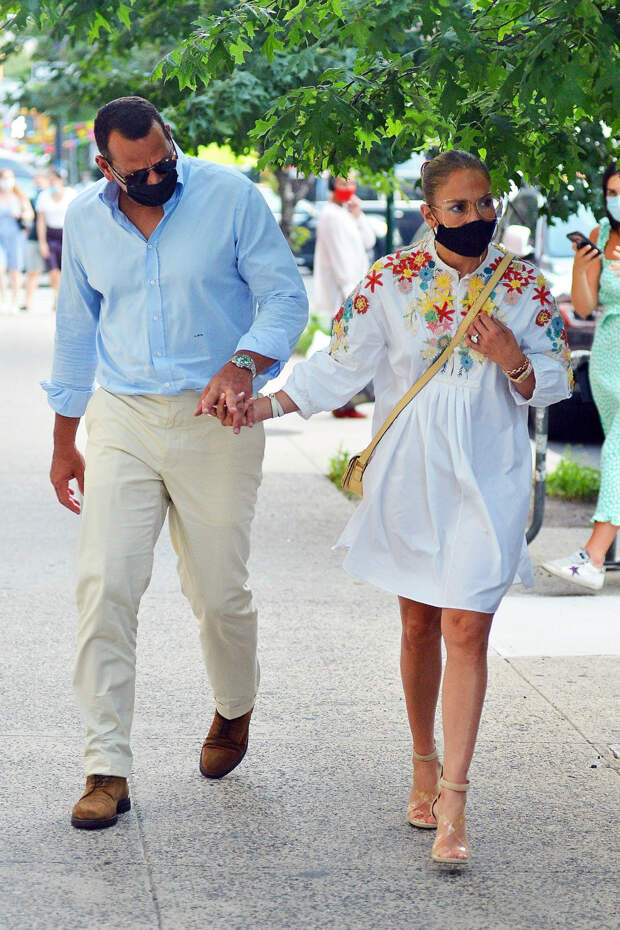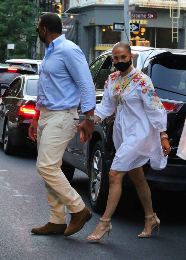 Дженнифер обожает яркие мини и облегающие силуэты. Однако на этот раз она определенно сделала ставку на романтику - и ее нежный образ стоит взять на заметку. Певица примерила белое платье длиной до бедра с ручной вышивкой в виде ярких цветов на рукавах и в районе декольте. Кремовые босоножки на каблуке и золотая сумка Valentino дополнили образ нашей героини. Из аксессуаров она выбрала золотые и бриллиантовые украшения, а также солнцезащитные очки и защитную маску.