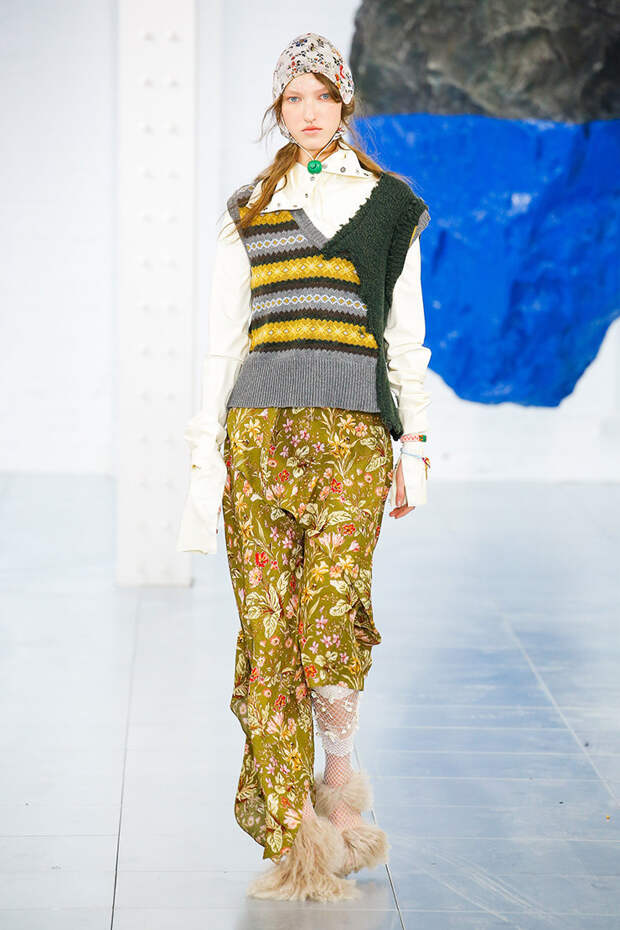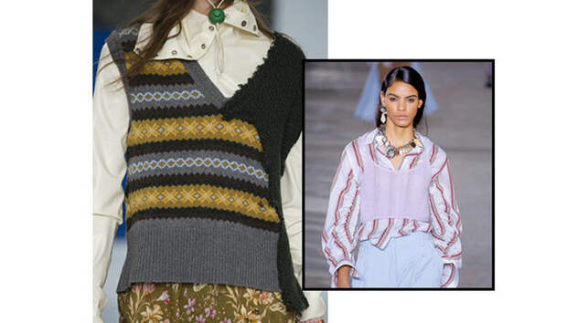 Кроме традиционных версий, напоминающих о школьной форме, есть и более изобретательные. Например, вязаная безрукавка с капюшоном из последней коллекции Кристофера Кейна для Burberry или длинные жилеты-платья Kenzo.