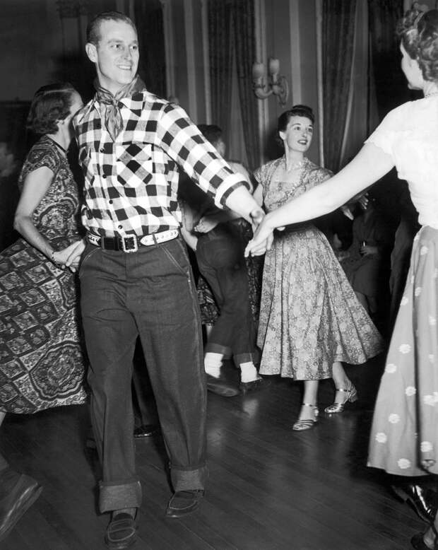 Принцесса Елизавета и герцог Эдинбургский исполняют канадские народные танцы во время поездки в Оттаву в 1951 году