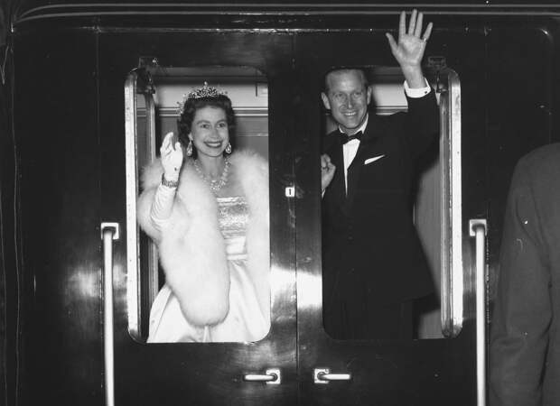 Королева Елизавета II и принц Филипп машут рукой, покидая Ливерпуль после посещения ледового шоу «Белоснежка и семь гномов», 25 мая 1961 года