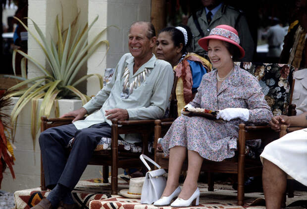 Королева Елизавета II и принц Филипп в традиционном ожерелье из ракушек, наблюдают за танцорами 27 октября 1982 года в Тувалу